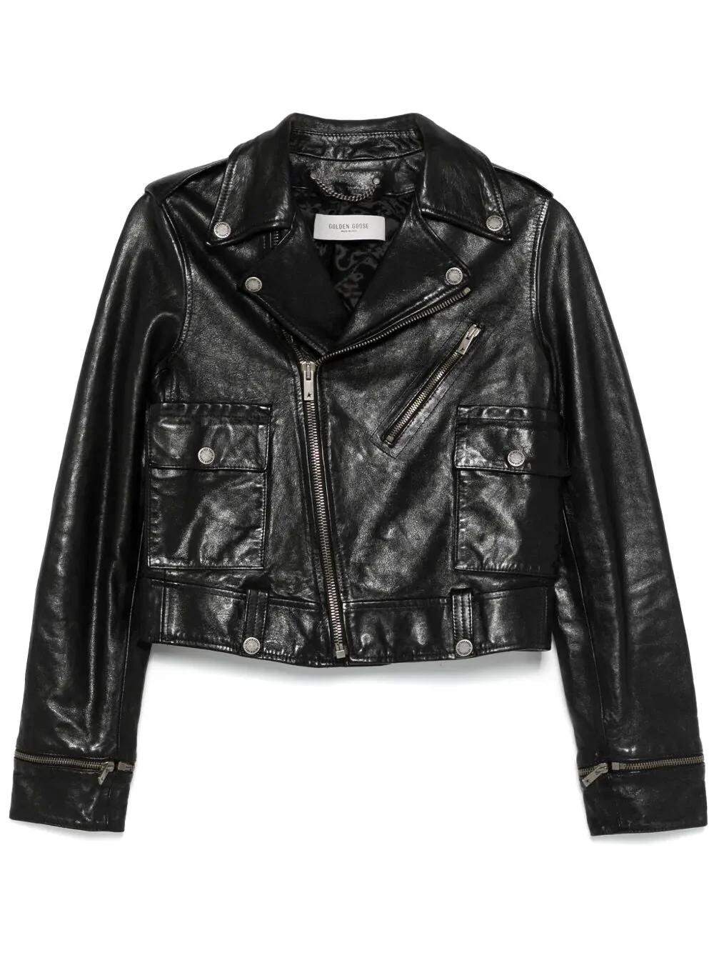 Women's black leather biker jacket with glossy effect