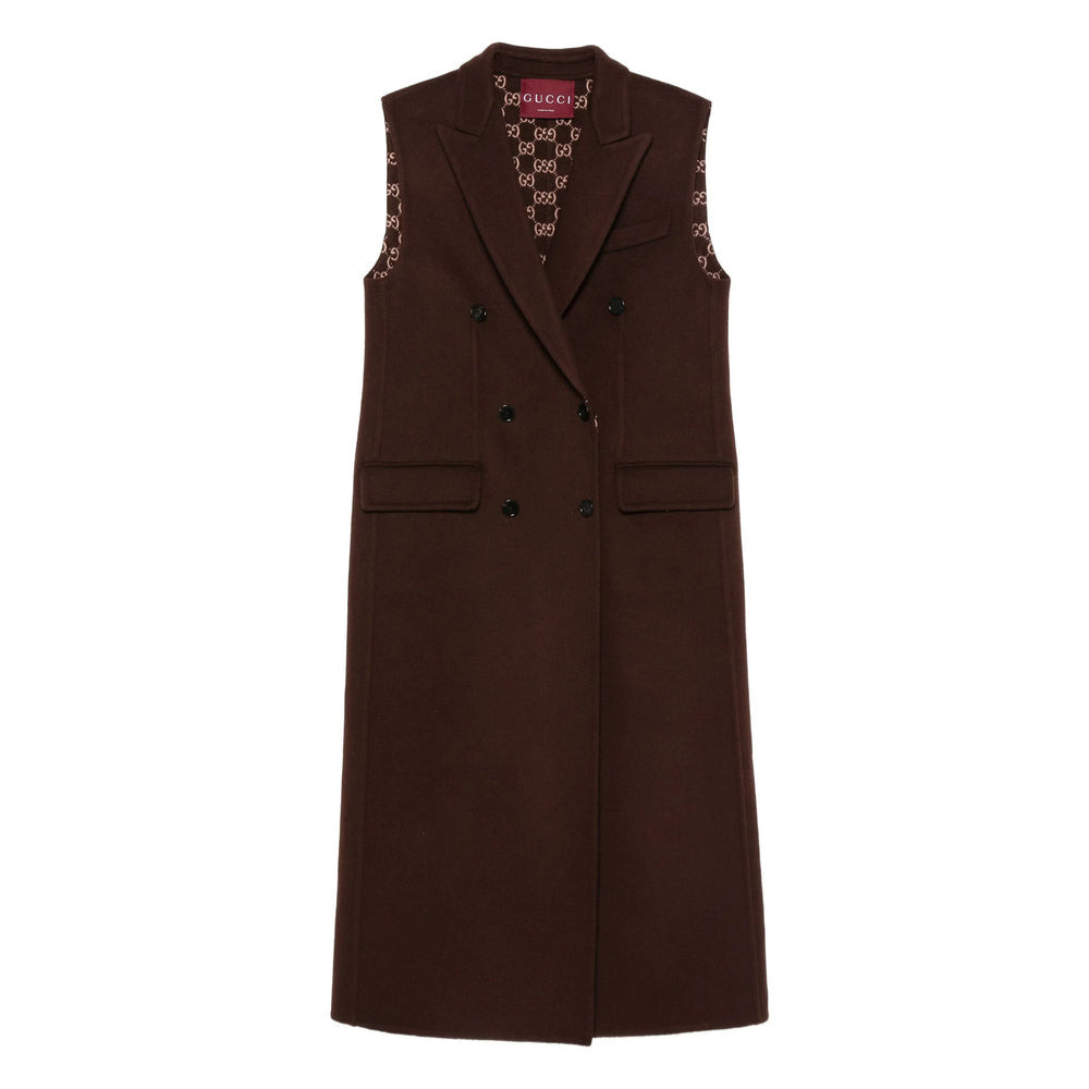 brown double-breasted fastening GG-logo pattern sleeveless wool-silk blend MADE IN:ItalyMATERIAL:Outer Composition Silk: 1.0%, Lining Composition Viscose: 100.0%, Outer Composition Wool: 99.0%COLOR:BROWN SKU: 832165Z7ASL2016 Our Products Are 100% Genuine. In All Cases We Stand By The Authenticity Of Every Product Sold On Our Site. All sales are final and we only accept returns for quality issue. Buyer is responsible for any import tax/duty if applicable.