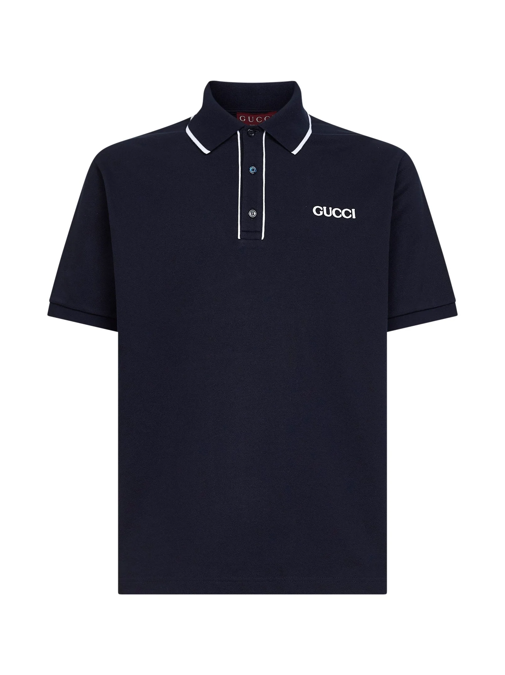 •Front three-button placket; contrasting trims at placket •Ribbed polo collar with contrasting trim •Short sleeves •Contrasting embossed Gucci embroidery at chest •Side slits at bottom •Straight hem, dropped back hem •Length: 73 cm (size M) •Regular fit •Navy blue color •100% Cotton •Made in Italy SKU: 806250xjhh64003 Our Products Are 100% Genuine. In All Cases We Stand By The Authenticity Of Every Product Sold On Our Site. All sales are final and we only accept returns for quality issue. Buyer is responsible for any import tax/duty if applicable.