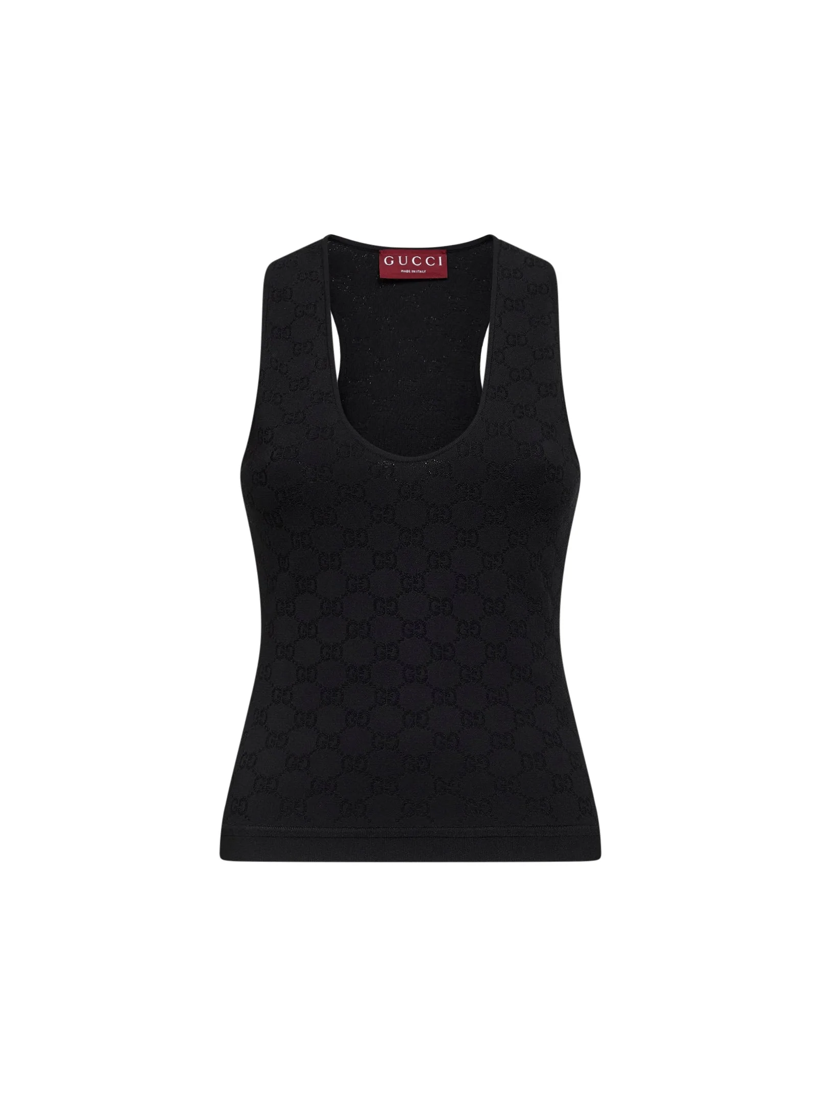 •U-neckline; racerback •Sleeveless •Straight hem •All-over jacquard GG pattern •Length: 55 cm (size S) •Black color •85% Viscose, 15% Polyester •Made in Italy SKU: 852275xkfcp1000 Our Products Are 100% Genuine. In All Cases We Stand By The Authenticity Of Every Product Sold On Our Site. All sales are final and we only accept returns for quality issue. Buyer is responsible for any import tax/duty if applicable.