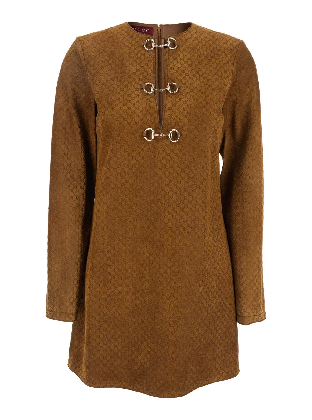 Gucci Women Brown Dress With Front Horsebit Details And All-Over Gg Motif In Suede Woman