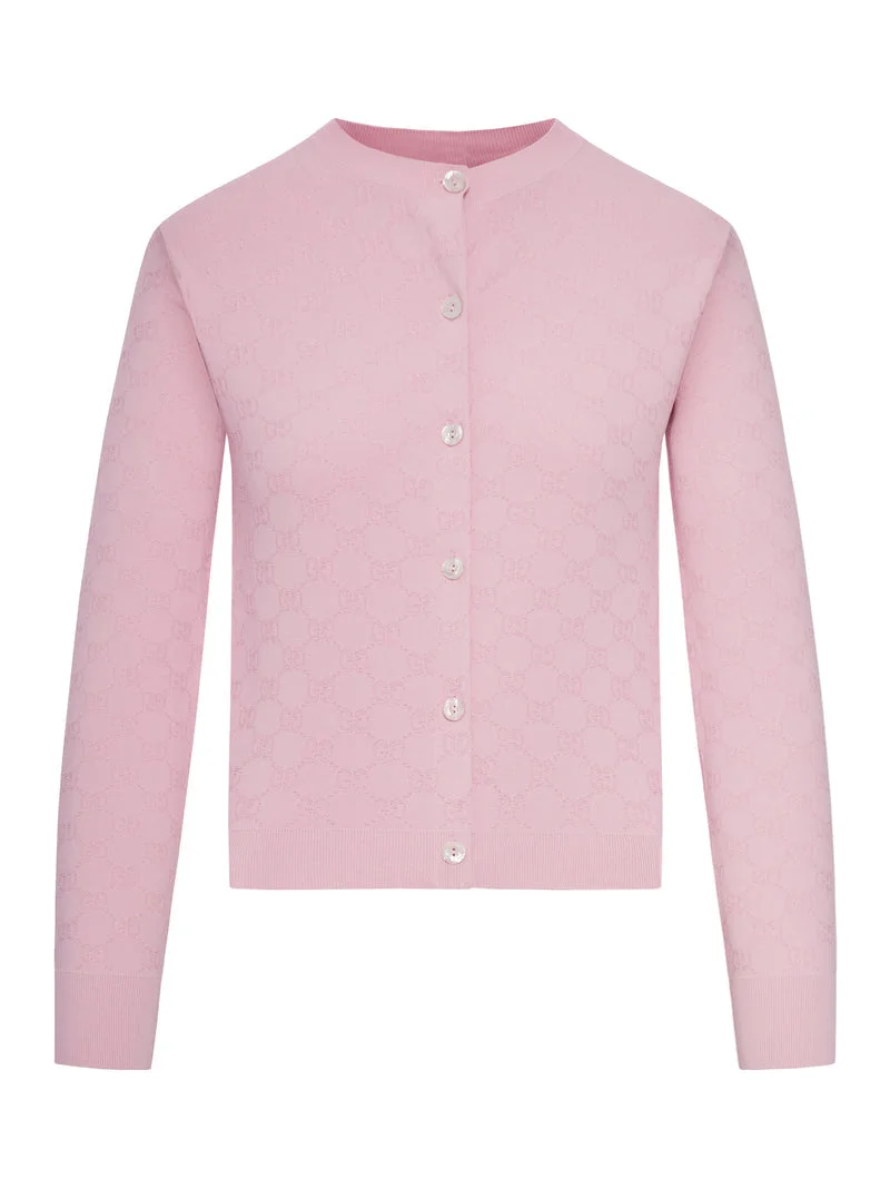 - Crew neck - Long sleeves - Front button closure - Fine light pink GG jacquard fabric - Ribbed trim - Length: 49 cm, based on size XS - Color: Magenta Made in Italy Composition: Viscose 85% viscose 15% polyester Color code: 5589 MAGENTA 864991XKFHU SKU: 864991XKFHU5589MAGENTA Our Products Are 100% Genuine. In All Cases We Stand By The Authenticity Of Every Product Sold On Our Site. All sales are final and we only accept returns for quality issue. Buyer is responsible for any import tax/duty if applicable.