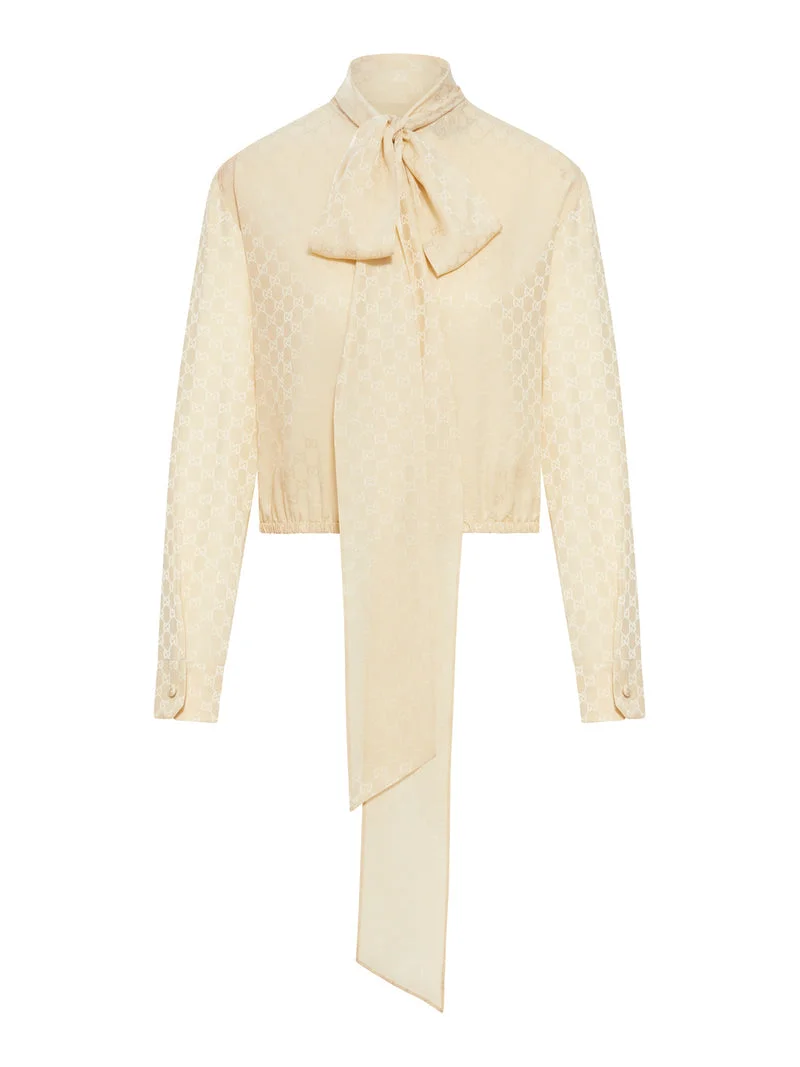 - GG jacquard silk - High neck with bow closure - Front button closure - Long sleeves - Buttoned cuffs - Elasticated hem - Regular fit - Color: Gardenia Made in Italy Composition: Silk 100% Silk Color code: 9853 GARDENIA 848566ZATF9 SKU: 848566ZATF99853GARDENIA Our Products Are 100% Genuine. In All Cases We Stand By The Authenticity Of Every Product Sold On Our Site. All sales are final and we only accept returns for quality issue. Buyer is responsible for any import tax/duty if applicable.
