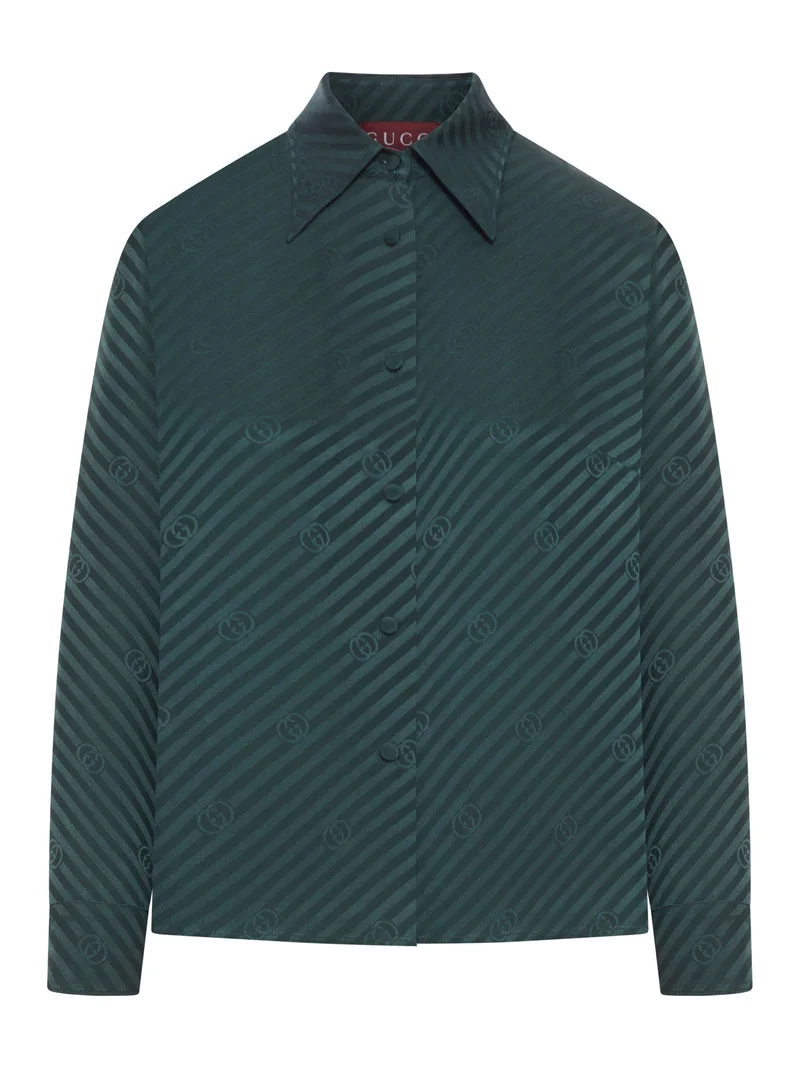 - Dark green jacquard silk with diagonal GG interlocking - Long pointed collar - Tone-on-tone button closure - Long sleeves - Tone-on-tone button cuffs - Length: 56 cm; size 38 (IT) - 100% silk - Color: Dark Green Made in Italy Composition: Silk 100% Silk Color code: 3514 DARK BOTTLE GREEN Size Type: IT SKU: 851629ZAM5B Our Products Are 100% Genuine. In All Cases We Stand By The Authenticity Of Every Product Sold On Our Site. All sales are final and we only accept returns for quality issue. Buyer is responsible for any import tax/duty if applicable.
