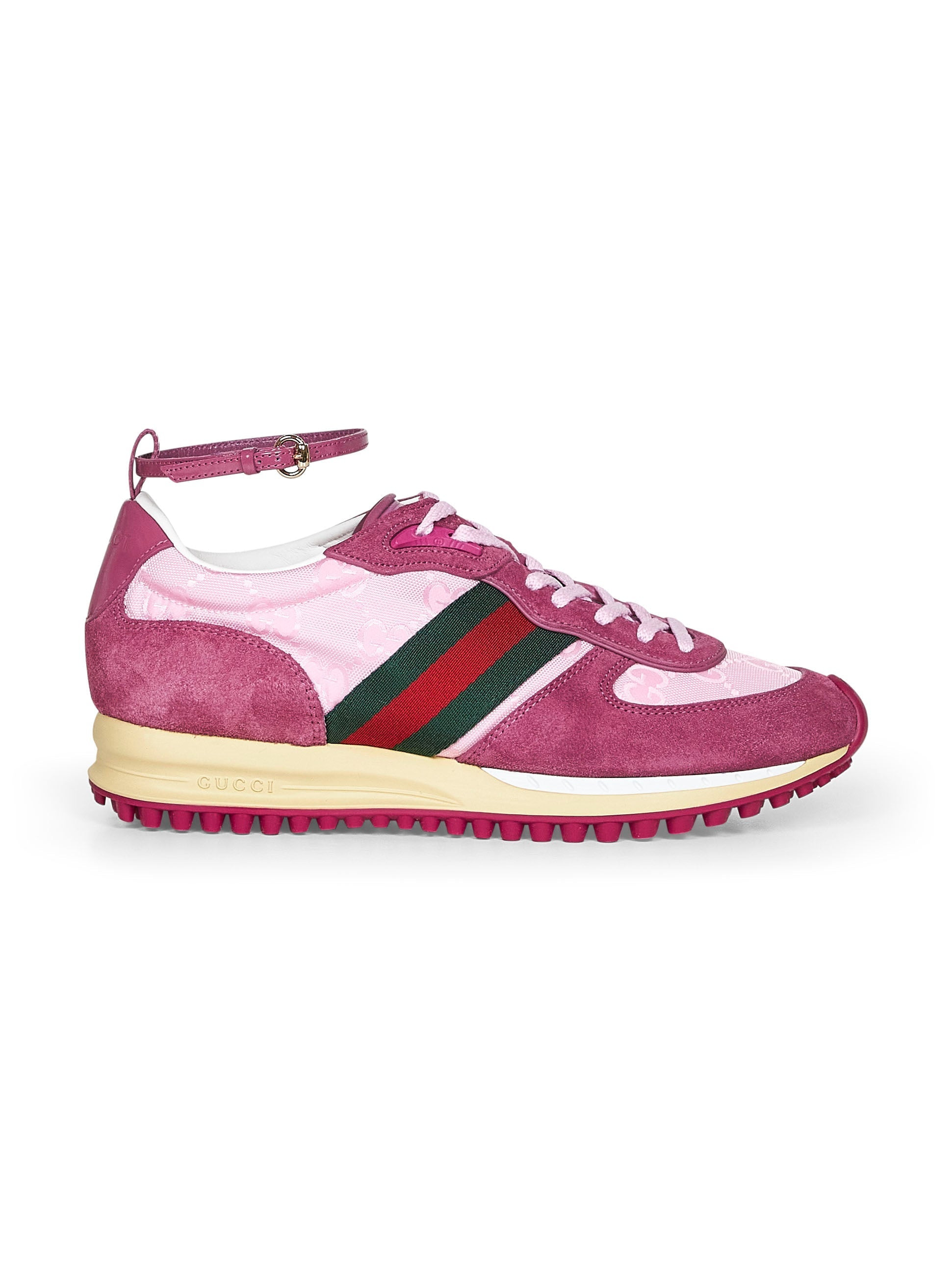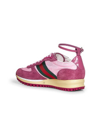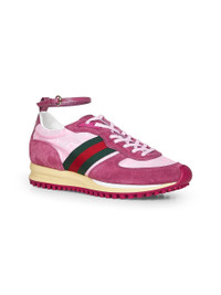 •Front lace-up fastening, Interlocking G details at eyelets; adjustable and detachable leather ankle strap with metal buckle •Round toe •Tongue with high-frequency embossed 3D Gucci script logo and Interlocking G •Embossed Gucci logo at back •Pink suede upper with pink GG nylon inserts and green and red Web at sides •Fabric lining •Rubber outsole with Interlocking G and Gucci script logo; contrasting tread •Pink color •100% Calf Leather •Made in Italy SKU: 840291aaezm5241 Our Products Are 100% Genuine. In All Cases We Stand By The Authenticity Of Every Product Sold On Our Site. All sales are final and we only accept returns for quality issue. Buyer is responsible for any import tax/duty if applicable.