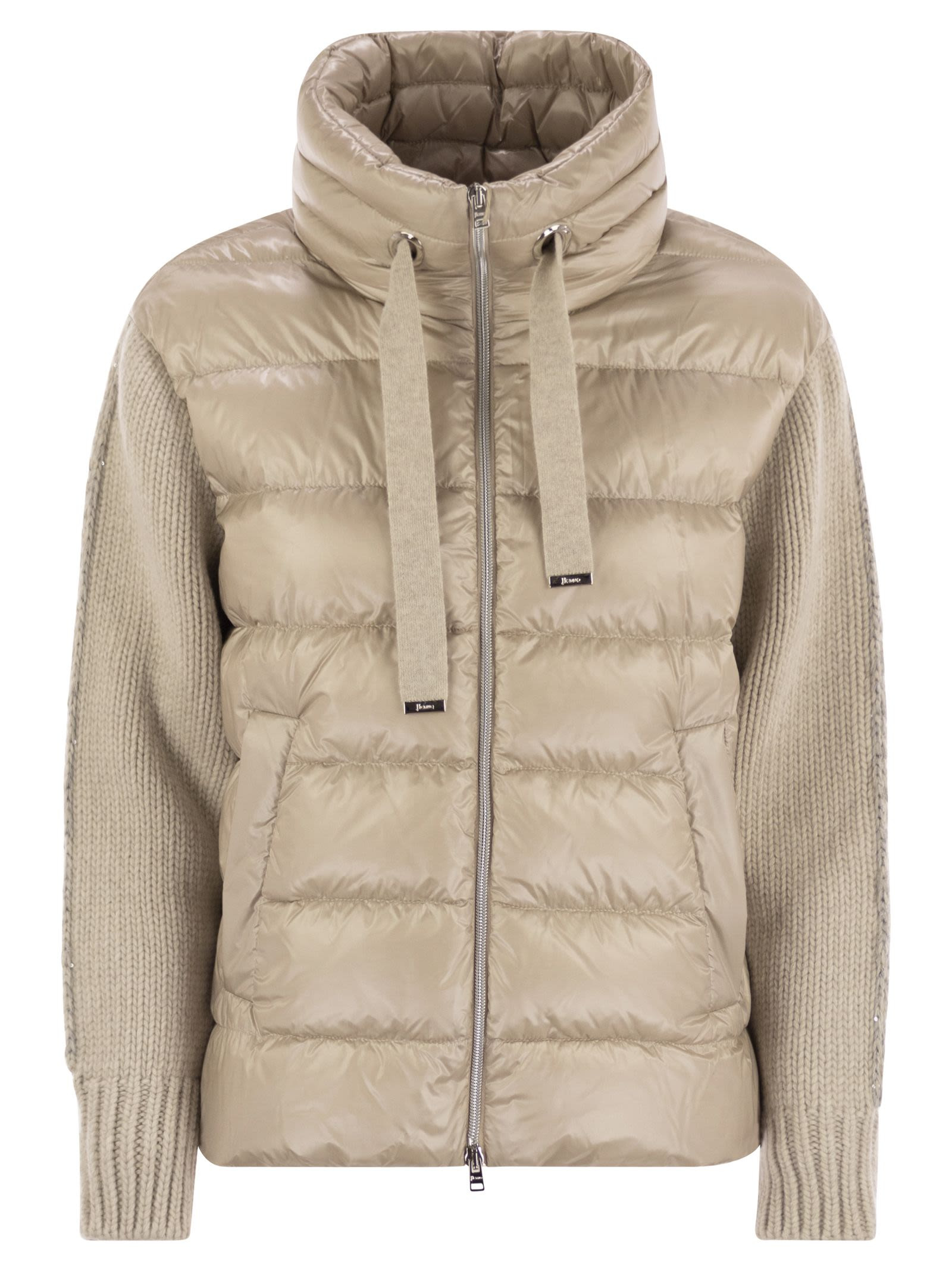 Jacket made of Herno's iconic Ultralight Nylon: an innovative technical fabric that combines good water resistance with a particularly luxurious silk-like feel. An elegant yet practical garment to wear thanks to the wool knit sleeves that offer maximum freedom of movement. - Regular fit - Down filling - Striped quilting - High collar with drawstring - Wool knit sleeves - Ribbed knit - Fineness 3 - Ribbed cuffs - Welt side pockets - Metal Herno logo on the back - Double-slider zip fastening - Performance: Water-repellent treatment DESIGNER ID: PI00138DR12017Z 1985 100% Polyamide Knitted fabric: 100% Wool Padding Pure goose down class 1: 90% Goose down, 10% Goose feather Size Type: IT SKU: PI00138DR12017Z1985 Our Products Are 100% Genuine. In All Cases We Stand By The Authenticity Of Every Product Sold On Our Site. All sales are final and we only accept returns for quality issue. Buyer is responsible for any import tax/duty if applicable.