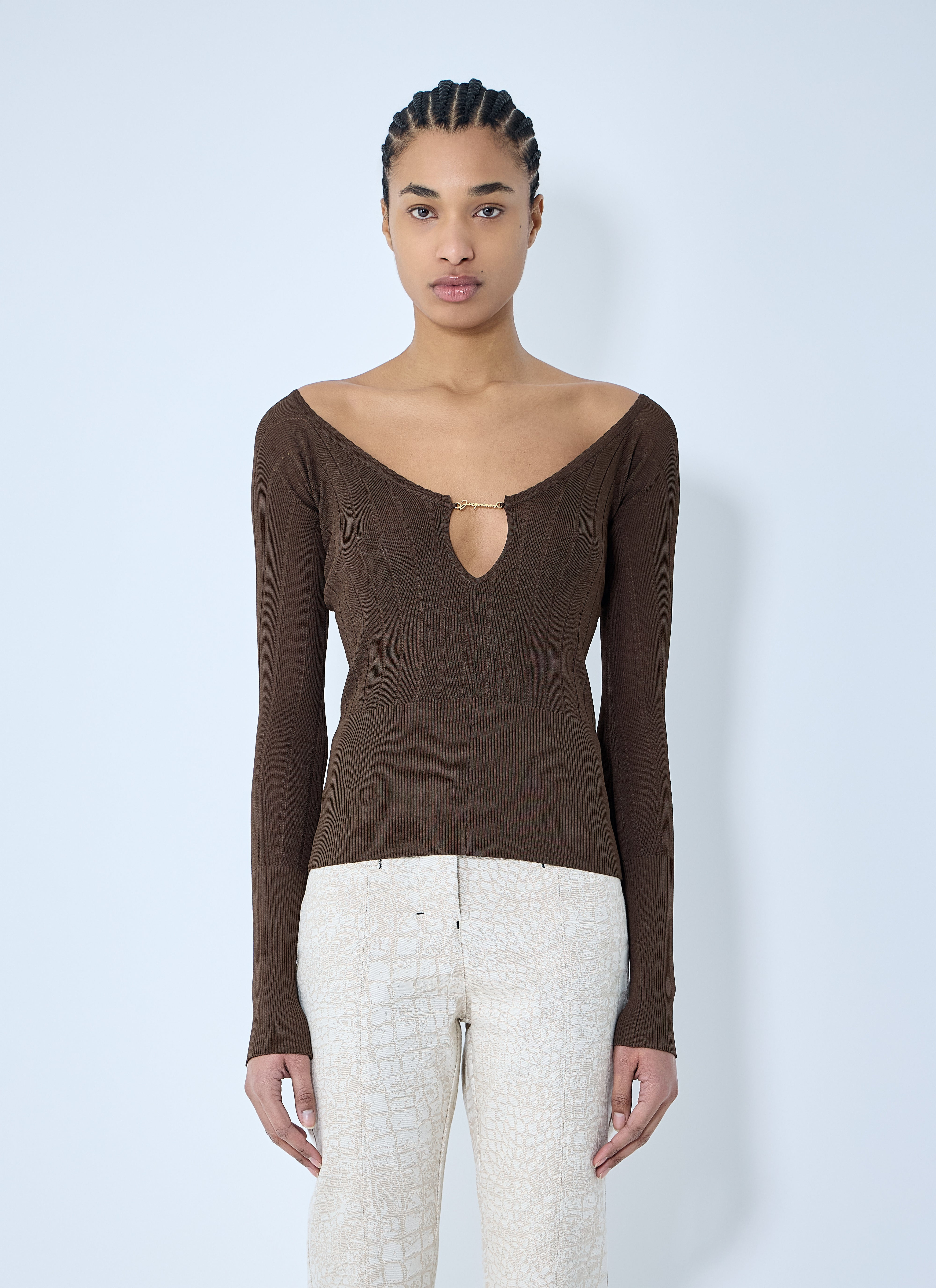 Knit top with front logo plaque. Plunge neck Long sleeves Front logo plaque Made in France 76% Viscose, 24% Polyamide. Hand wash 24E251KN357-2424 880 SKU: 24E251KN3572424880 Our Products Are 100% Genuine. In All Cases We Stand By The Authenticity Of Every Product Sold On Our Site. All sales are final and we only accept returns for quality issue. Buyer is responsible for any import tax/duty if applicable.