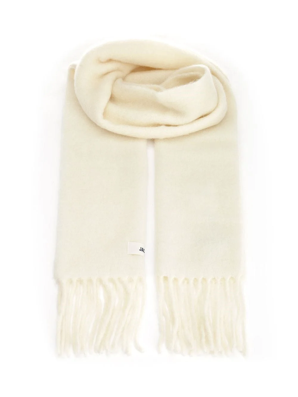 Wool blend scarf by Jacquemus, with grosgrain logo and short fringed sides W.280 X H.40 cm PRINCIPAL:28% MOHAIR 28% ALPACA WOOL 24% VIRGIN WOOL 20% POLYAMIDE Made in: IT SKU: 24HACU00572BOT4032110 Our Products Are 100% Genuine. In All Cases We Stand By The Authenticity Of Every Product Sold On Our Site. All sales are final and we only accept returns for quality issue. Buyer is responsible for any import tax/duty if applicable.