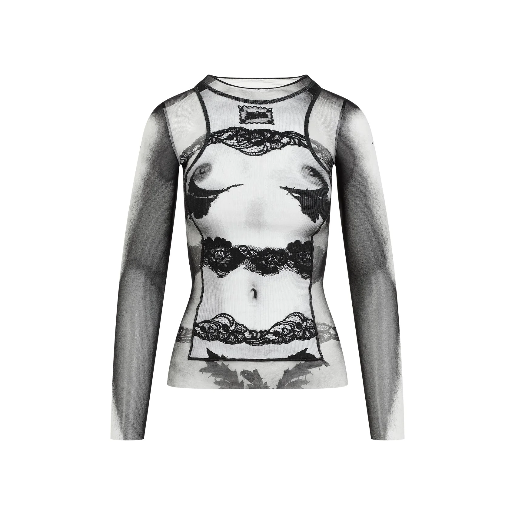 Jean Paul Gaultier Black "Body Lace Mariniere" Top. Crafted in polyamide fabric. Crew neck, long sleeves, straight hem, transparent details, multi-layer construction, black lace details all-over. Polyamide | 100%POLYAMIDE Size Type: INT SKU: FTO227T564Black Our Products Are 100% Genuine. In All Cases We Stand By The Authenticity Of Every Product Sold On Our Site. All sales are final and we only accept returns for quality issue. Buyer is responsible for any import tax/duty if applicable.