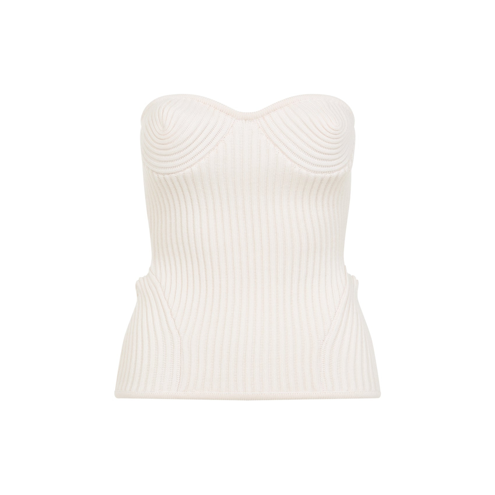 Jean Paul Gaultier White Merino Wool Ribbed Stretch Corset. Pure white merino wool, strapless, sweetheart neck, back tonal strap, sleeveless, corset design, straight hem, ribbed all-over. Wool | 100%MERINO WOOL Size Type: INT SKU: 2503WPO010K00101White Our Products Are 100% Genuine. In All Cases We Stand By The Authenticity Of Every Product Sold On Our Site. All sales are final and we only accept returns for quality issue. Buyer is responsible for any import tax/duty if applicable.