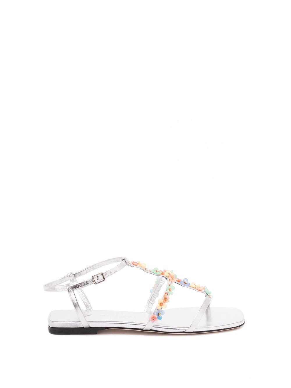 Gwyn Daisy Flat Silver Metallic Nappa Sandal with Daisy Embroidery