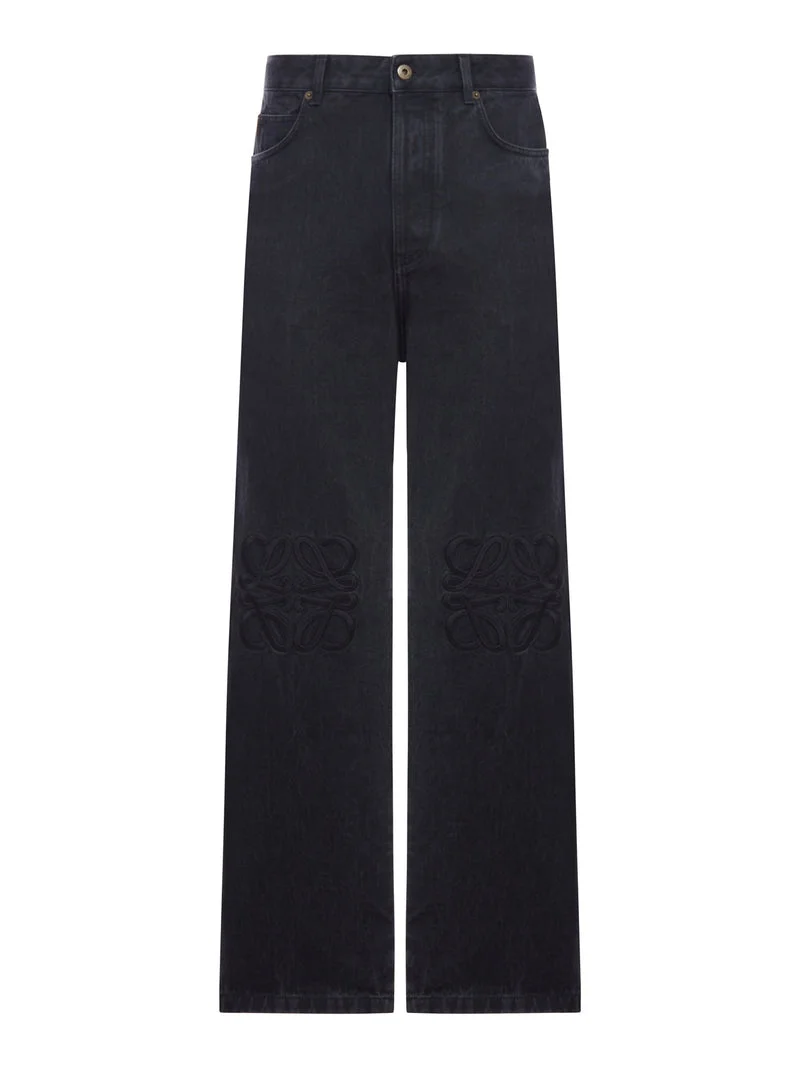 - Midweight washed cotton denim jeans - Anagram embroidery on the knees - Relaxed fit - Standard length - Mid-rise - Wide leg - Five pockets - Concealed button closure - Leather patch with embossed LOEWE lettering on the back - Color: Black Made in Italy Composition: Cotton 85% cotton 10% Polyester 5% calf skin Color code: 1100 BLACK Size Type: IT SKU: H526Y11WA4 Our Products Are 100% Genuine. In All Cases We Stand By The Authenticity Of Every Product Sold On Our Site. All sales are final and we only accept returns for quality issue. Buyer is responsible for any import tax/duty if applicable.