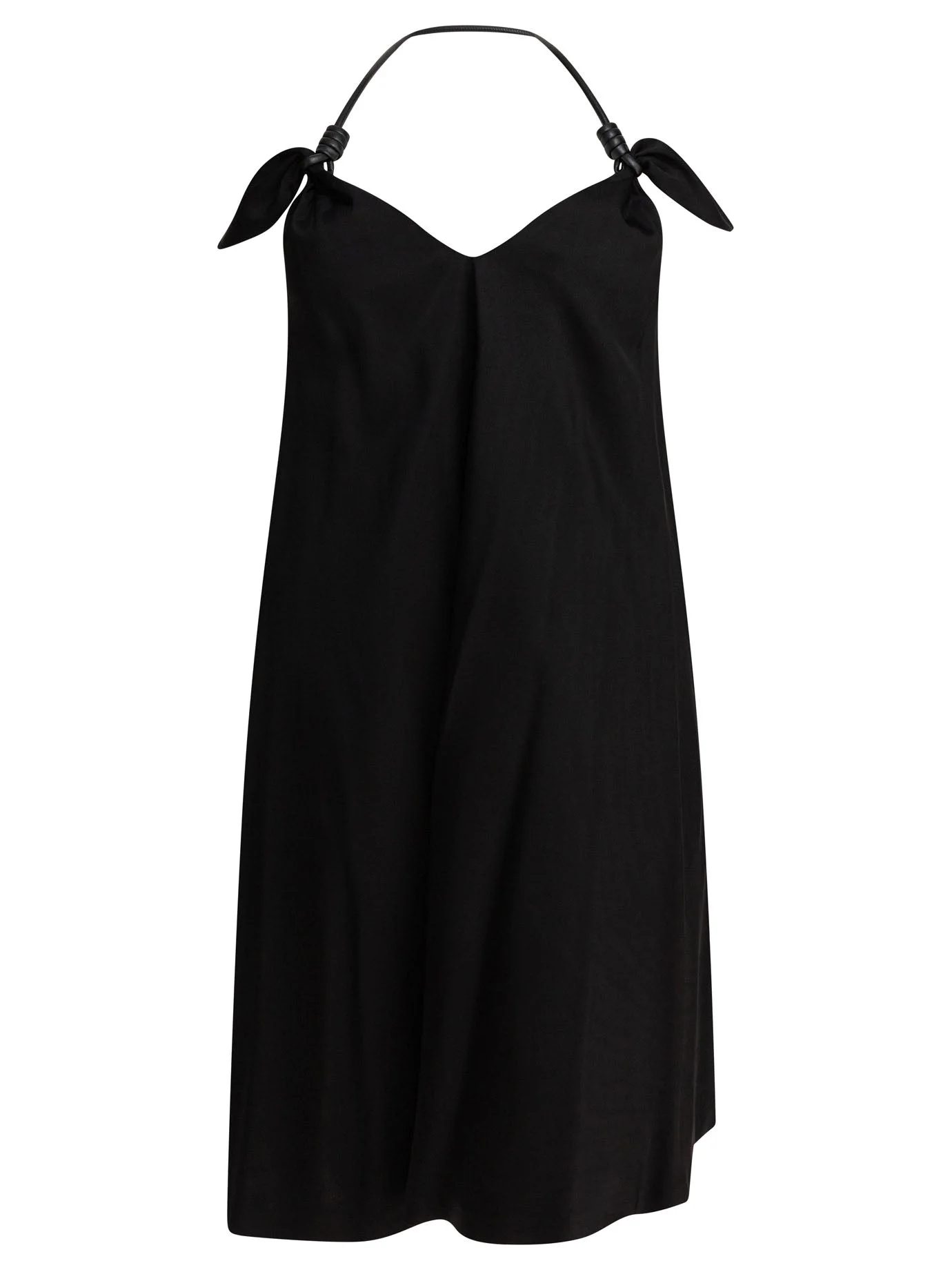 Loewe "Flamenco" dress made of medium-weight stretch viscose cady. The silhouette features an American neckline, open back, and opening at the back. The construction includes flamenco-inspired knots applied near the shoulder straps. Fully lined model with regular fit, detailed with in-seam pockets and front V-neckline. Material offers structural stretch and a defined fit. || - Solid color - Open back dress - Sleeveless - V-neckline - American neckline - Back opening - Flamenco-inspired decorative knots - Inseam pockets - Fully lined pattern - Medium weight - Regular fit 96% viscose 4% elastane SKU: S359Y09XH4BLACK Our Products Are 100% Genuine. In All Cases We Stand By The Authenticity Of Every Product Sold On Our Site. All sales are final and we only accept returns for quality issue. Buyer is responsible for any import tax/duty if applicable.