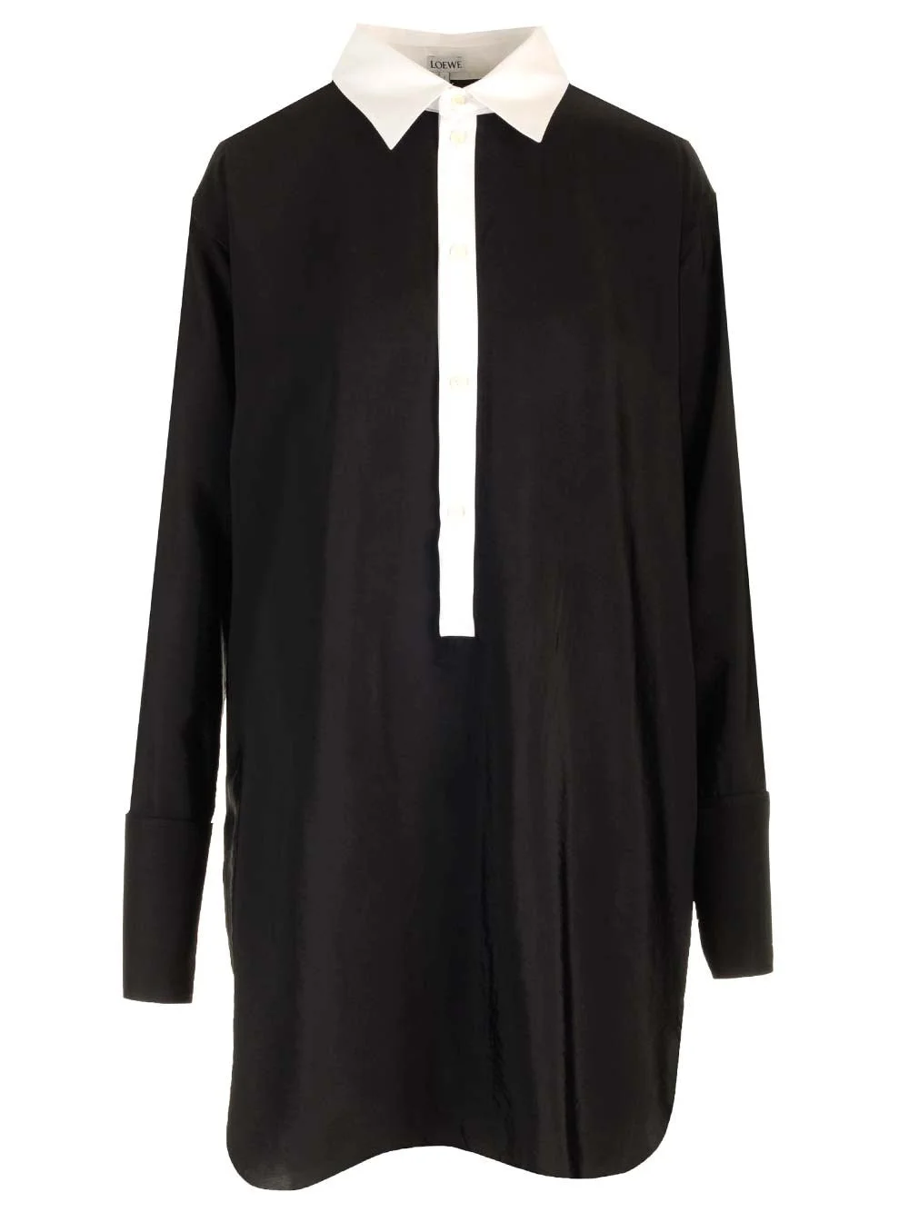 Shirt dress from Loewe in black viscose blend, relaxed fit, knee length, contrasting collar and buttoning, contrasting detachable collar and cuffs, front button closure, box pleat on the back, asymmetric hem from front to back with vents sides, anagram embroidery positioned on the hem. Exterior: 10.4% POLIAMIDA-POLYAMIDE 5.0% POLIESTER-POLYESTER 69.6% VISCOSA-VISCOSE 15.0% ALGODON-COTTON Made in: IT SKU: S540Y09XOD1100 Our Products Are 100% Genuine. In All Cases We Stand By The Authenticity Of Every Product Sold On Our Site. All sales are final and we only accept returns for quality issue. Buyer is responsible for any import tax/duty if applicable.