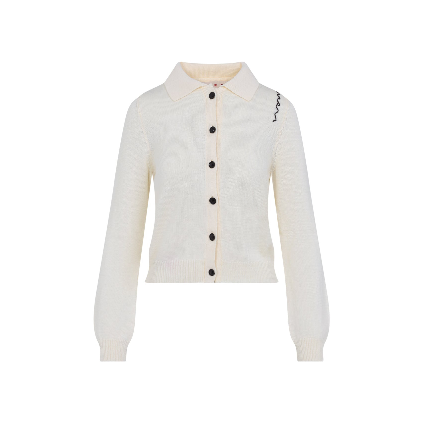 Marni White Cotton Cardigan. Crafted from white cotton yarn, pointed collar, front button fastening, black contrasting signature embroidery at the shoulder, long sleeves, ribbed edges. Cotton | 100%COTTON Size Type: IT SKU: CDMD0404A0UFCN55White Our Products Are 100% Genuine. In All Cases We Stand By The Authenticity Of Every Product Sold On Our Site. All sales are final and we only accept returns for quality issue. Buyer is responsible for any import tax/duty if applicable.