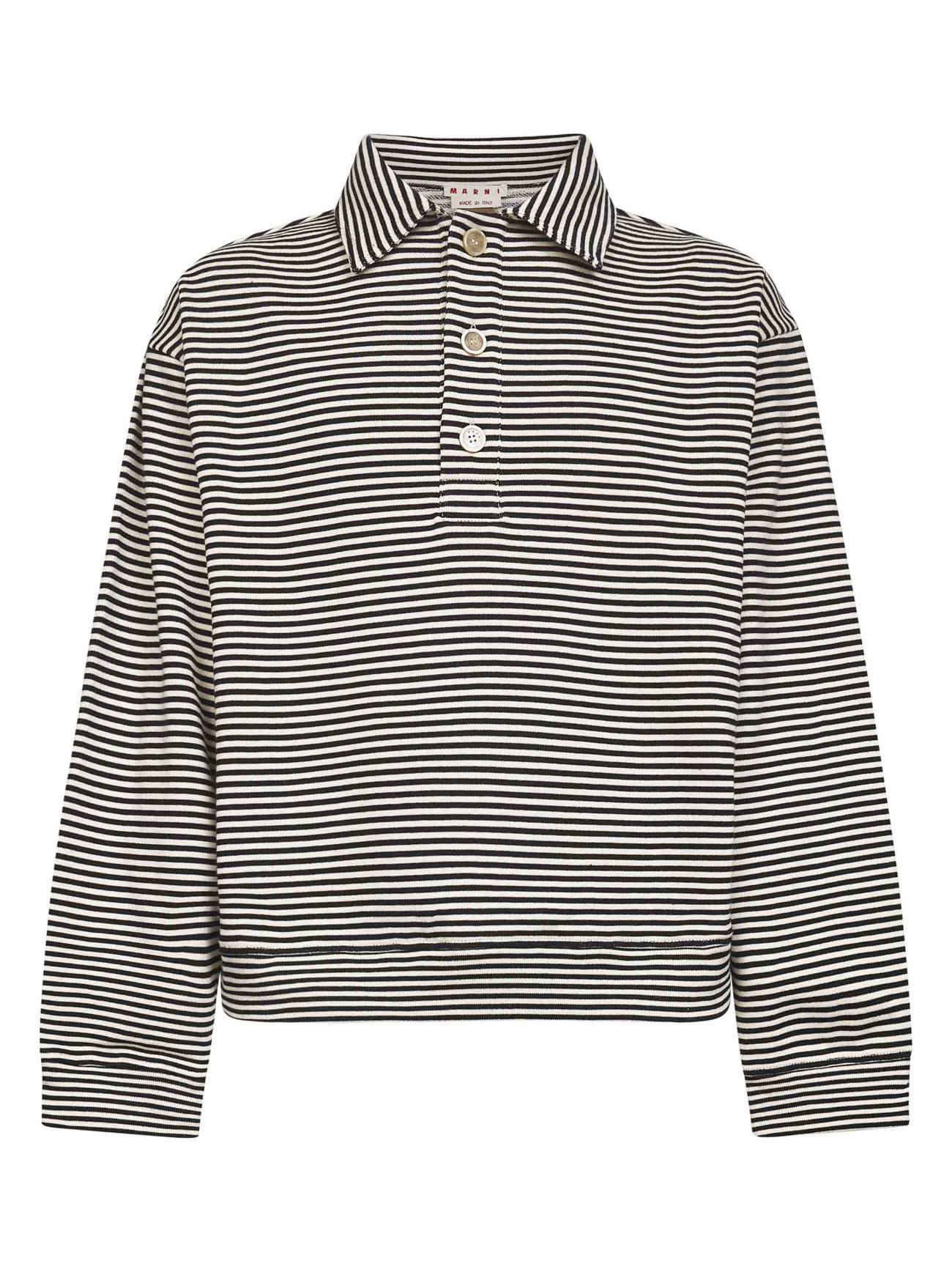 •Front three-button placket •Polo collar •Long sleeves, dropped shoulders •Marni label sewn at neck back •Elasticated cuffs and bottom band •Horizontal striped pattern •Boxy fit •Black color •100% Cotton •Made in Italy SKU: fumu0145x1utc525stn99 Our Products Are 100% Genuine. In All Cases We Stand By The Authenticity Of Every Product Sold On Our Site. All sales are final and we only accept returns for quality issue. Buyer is responsible for any import tax/duty if applicable.