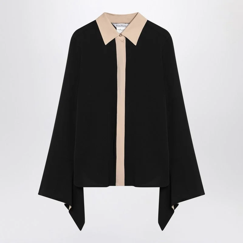 Black silk shirt from Max Mara featuring a fluid fit, contrasting colour-block detailing, a pointed collar, long sleeves with ruffled cuffs, rounded side slits and a concealed front button fastening. Model wears size 40 IT Model measurements: Height: 179 cm Chest: 82 cm Waist: 65 cm Hips: 90 cm Size Type: IT Material: Cotton SKU: PIOCO/QMAXM004102 Our Products Are 100% Genuine. In All Cases We Stand By The Authenticity Of Every Product Sold On Our Site. All sales are final and we only accept returns for quality issue. Buyer is responsible for any import tax/duty if applicable.