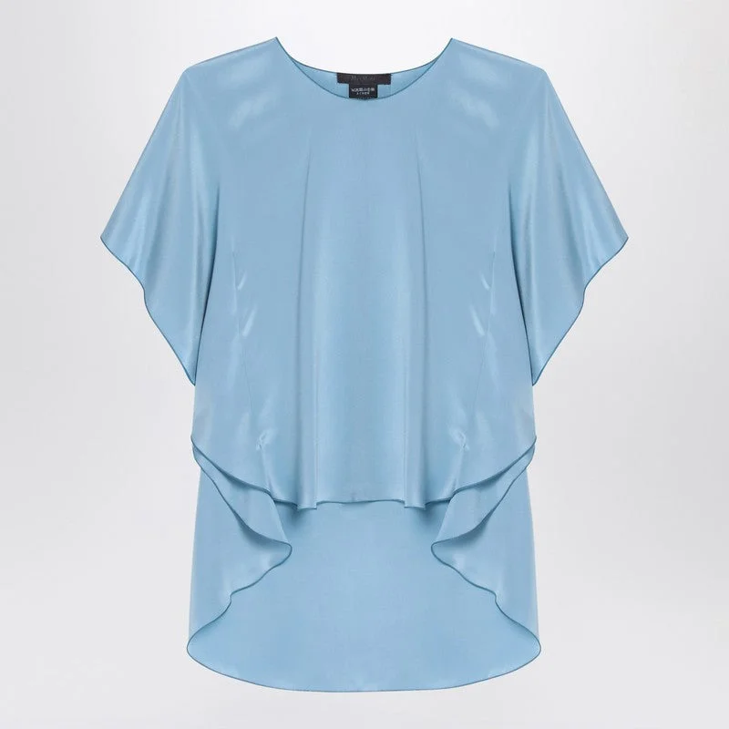 Max Mara Pianoforte blouse in heavy sky blue silk crepe de chine, characterized by a fluid design, short ruffled sleeves, a wide round neckline, and an asymmetrical rounded hem that is longer at the back. Model wears size 40 IT Model measurements: Height: 178 cm Chest: 89 cm Waist: 62 cm Hips: 88 cm Size Type: IT Material: Silk SKU: ORONTESI/QMAXMP038102 Our Products Are 100% Genuine. In All Cases We Stand By The Authenticity Of Every Product Sold On Our Site. All sales are final and we only accept returns for quality issue. Buyer is responsible for any import tax/duty if applicable.