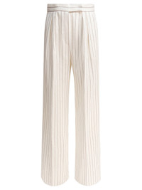 Max Mara's wide-leg trousers embody elegance and comfort in a garment that redefines oversize fit. Designed for the modern woman, these trousers feature a wide-leg silhouette with double front darts, ideal for any formal or casual occasion. The essence of pinstripes blends with a high waist for a sophisticated and timeless look. || - Double pleats on the front - High rise - Zipper and hook-and-eye closure - French pockets on the hips - Pinstripe effect stitching || Perfect to pair with a silk shirt and blazer for a professional look, or with a soft tee and long cardigan for a casual chic approach. Complete your outfit with leather accessories and mid-heel shoes. 62% cotton 38% linen SKU: 2511781022600CLARION001 Our Products Are 100% Genuine. In All Cases We Stand By The Authenticity Of Every Product Sold On Our Site. All sales are final and we only accept returns for quality issue. Buyer is responsible for any import tax/duty if applicable.