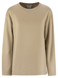 Silk and cotton crewneck sweatshirt, personalised with embossed Max Mara logo on the front. - Straight line - Long sleeves with dropped shoulder - Deep side slits - Plush lining DESIGNER ID: 2521926028600 003 55% Silk, 43% Cotton, 2% Elastane Size Type: INT SKU: 2521926028600003 Our Products Are 100% Genuine. In All Cases We Stand By The Authenticity Of Every Product Sold On Our Site. All sales are final and we only accept returns for quality issue. Buyer is responsible for any import tax/duty if applicable.