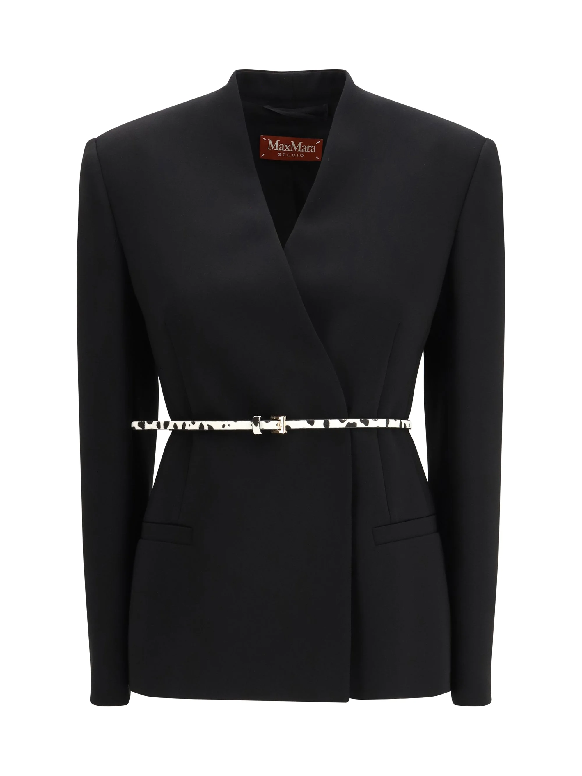 The double-breasted cady Jacket by Max Mara Studio delivers contemporary elegance with a tailored sensibility. Defined by a shaped silhouette, it features a standing collar and set-in sleeves with side slits, adding structure and refinement to the design. A concealed snap-button fastening ensures a clean, streamlined look, while horizontal welt pockets at the front provide discreet functionality. The jacket is enhanced by a cinched waist with stitched detailing and a slim matching suede-effect belt, elegantly defining the waist. Fully lined for comfort and a polished fit. Size Type: IT SKU: 2616041035600001 Our Products Are 100% Genuine. In All Cases We Stand By The Authenticity Of Every Product Sold On Our Site. All sales are final and we only accept returns for quality issue. Buyer is responsible for any import tax/duty if applicable.