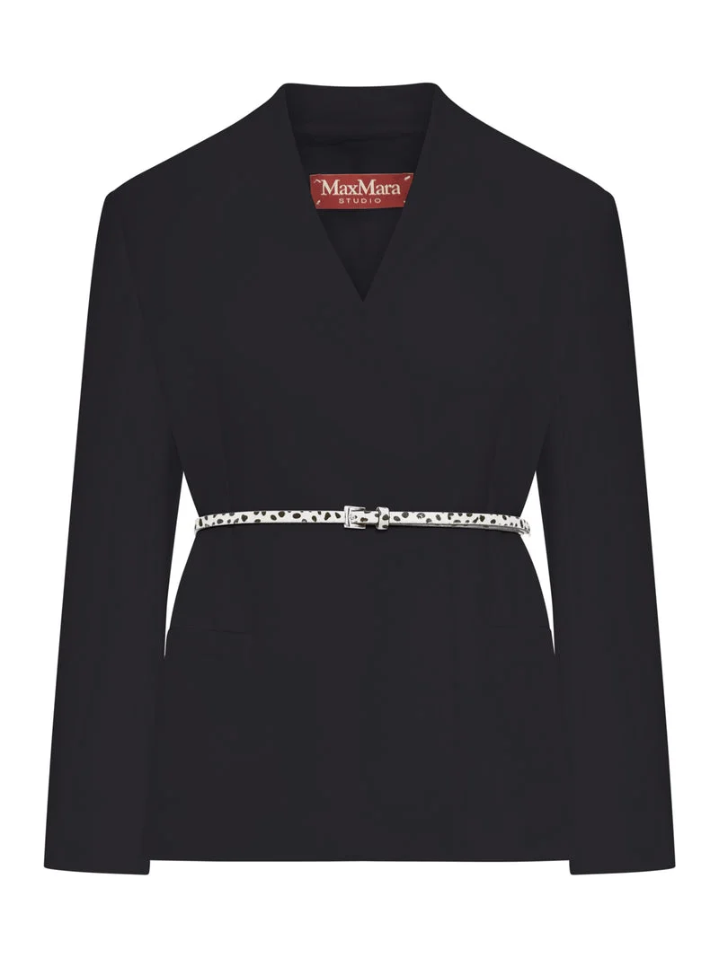 - Double-breasted cady jacket - Peak collar - Set-in sleeves with side slits - Concealed snap closure - Horizontal welt pockets on the front - Fitted silhouette - Matching suede-effect belt - Fitted fit with topstitching at the waist - Lined - Color: Black Made in Italy Composition: Triacetate 71% triacetate 29% polyester Color code: 001 BLACK 2616041035600 SKU: 2616041035600001BLACK Our Products Are 100% Genuine. In All Cases We Stand By The Authenticity Of Every Product Sold On Our Site. All sales are final and we only accept returns for quality issue. Buyer is responsible for any import tax/duty if applicable.