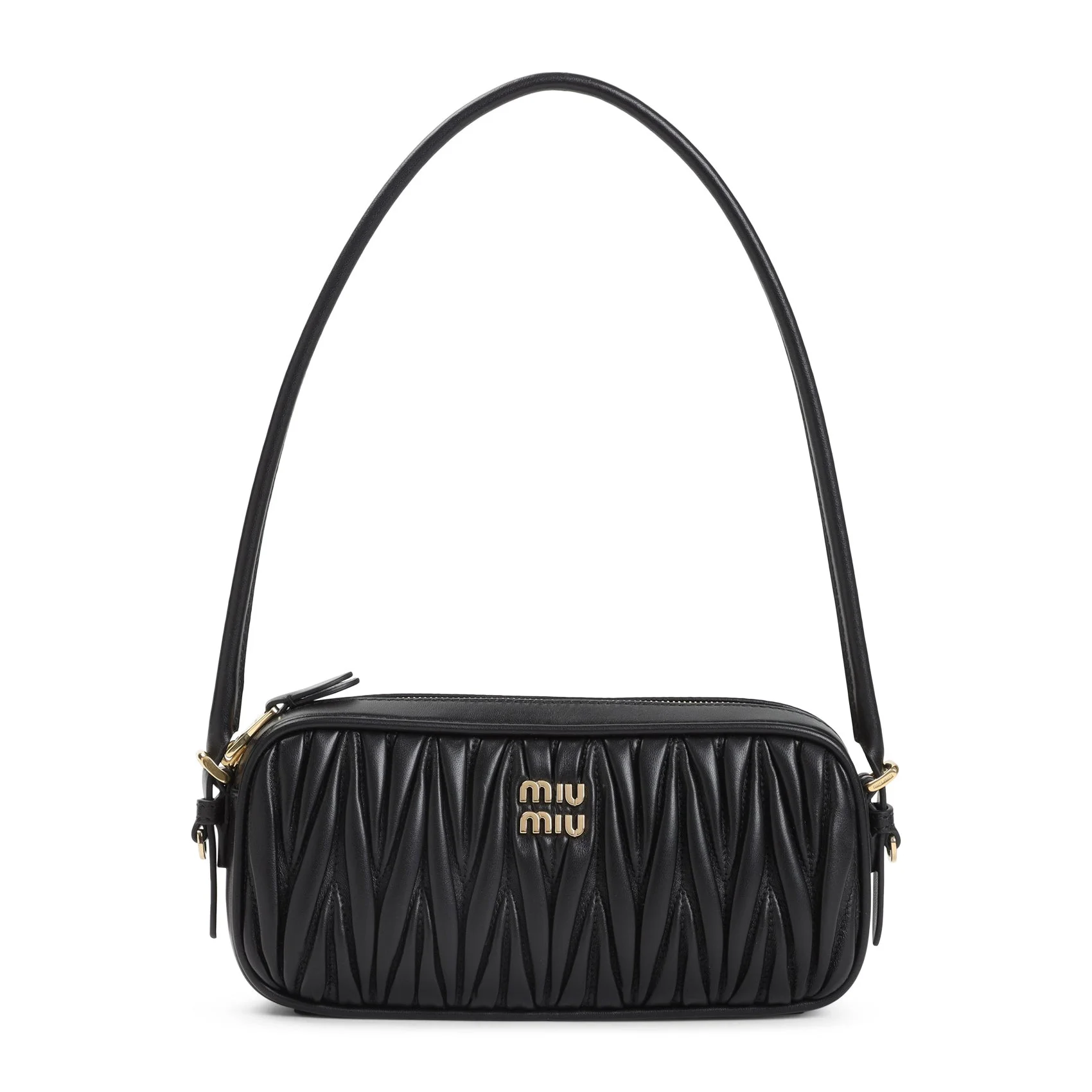 Miu Miu Black Lamb Leather Shoulder Bag. Crafted from black matelasse lamb leather, gold-toned hardware, detachable and adjustable shoulder strap, top zip fastening, metal logo plaque on the front, fully lined. Leather | 100%LAMB LEATHER W:21cm H:9,5cm D:4cm Size Type: One Size SKU: 5NE024AFPPBlack Our Products Are 100% Genuine. In All Cases We Stand By The Authenticity Of Every Product Sold On Our Site. All sales are final and we only accept returns for quality issue. Buyer is responsible for any import tax/duty if applicable.