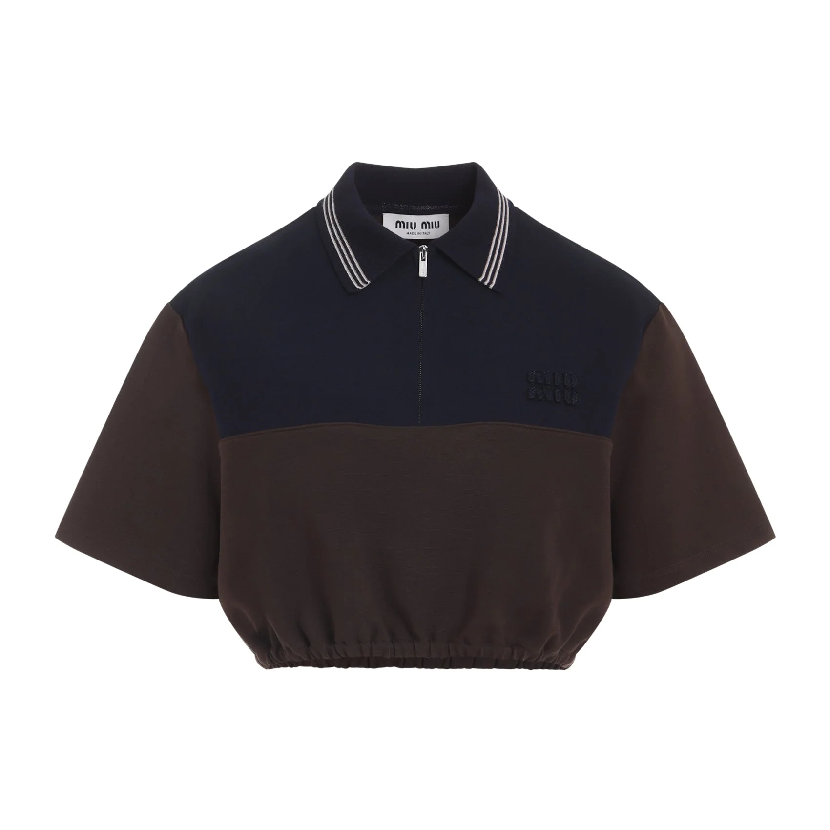 Miu Miu Cacao and Blue Cropped Viscose Top. Cacao and Blue viscose blend, polo collar, front zip fastening, short sleeves, cropped elasticated waist. Regular fit, logo on chest. Polyamide | 85%VISCOSE 11%POLYAMIDE 4%ELASTAN Size Type: IT SKU: MT2169SOOO18FXBrown Our Products Are 100% Genuine. In All Cases We Stand By The Authenticity Of Every Product Sold On Our Site. All sales are final and we only accept returns for quality issue. Buyer is responsible for any import tax/duty if applicable.