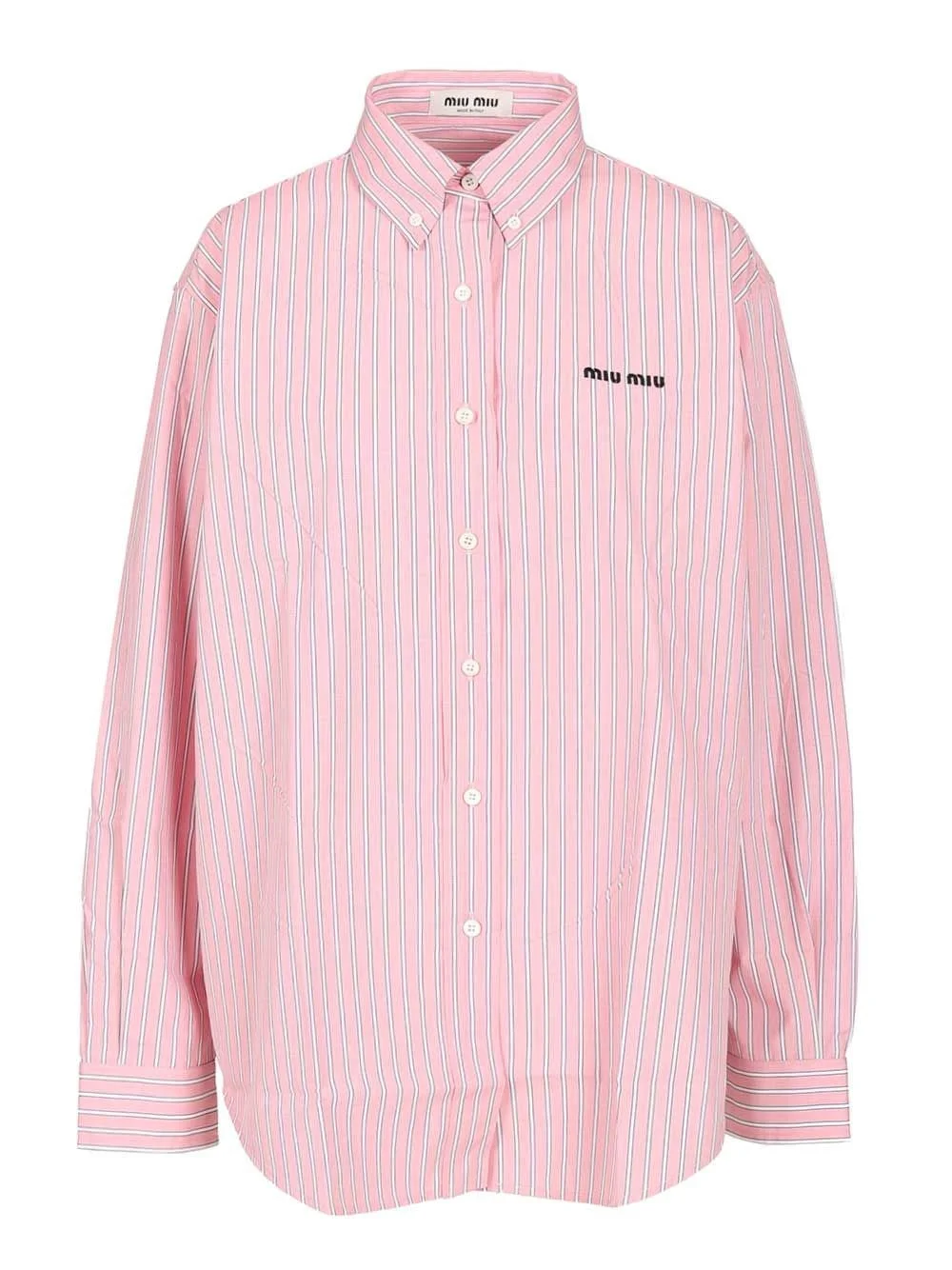 Poplin shirt by Miu Miu, loose fit, classic collar with buttons, front fastening with buttons, patterned fabric with thin vertical stripes, sleeves with buttons at the cuffs, embroidered logo on the front and pleats on the back that start from under the yoke. 100%CO-100%TROCHUS NILOTICUS Made in: IT SKU: MK2007SOOO180UF0028 Our Products Are 100% Genuine. In All Cases We Stand By The Authenticity Of Every Product Sold On Our Site. All sales are final and we only accept returns for quality issue. Buyer is responsible for any import tax/duty if applicable.