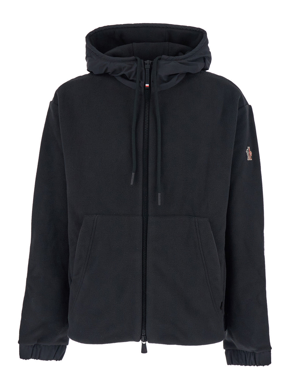 Moncler Grenoble Men Black Cardigan With Drawstring Hood And Logo Embroidery On The Sleeve In Tech F