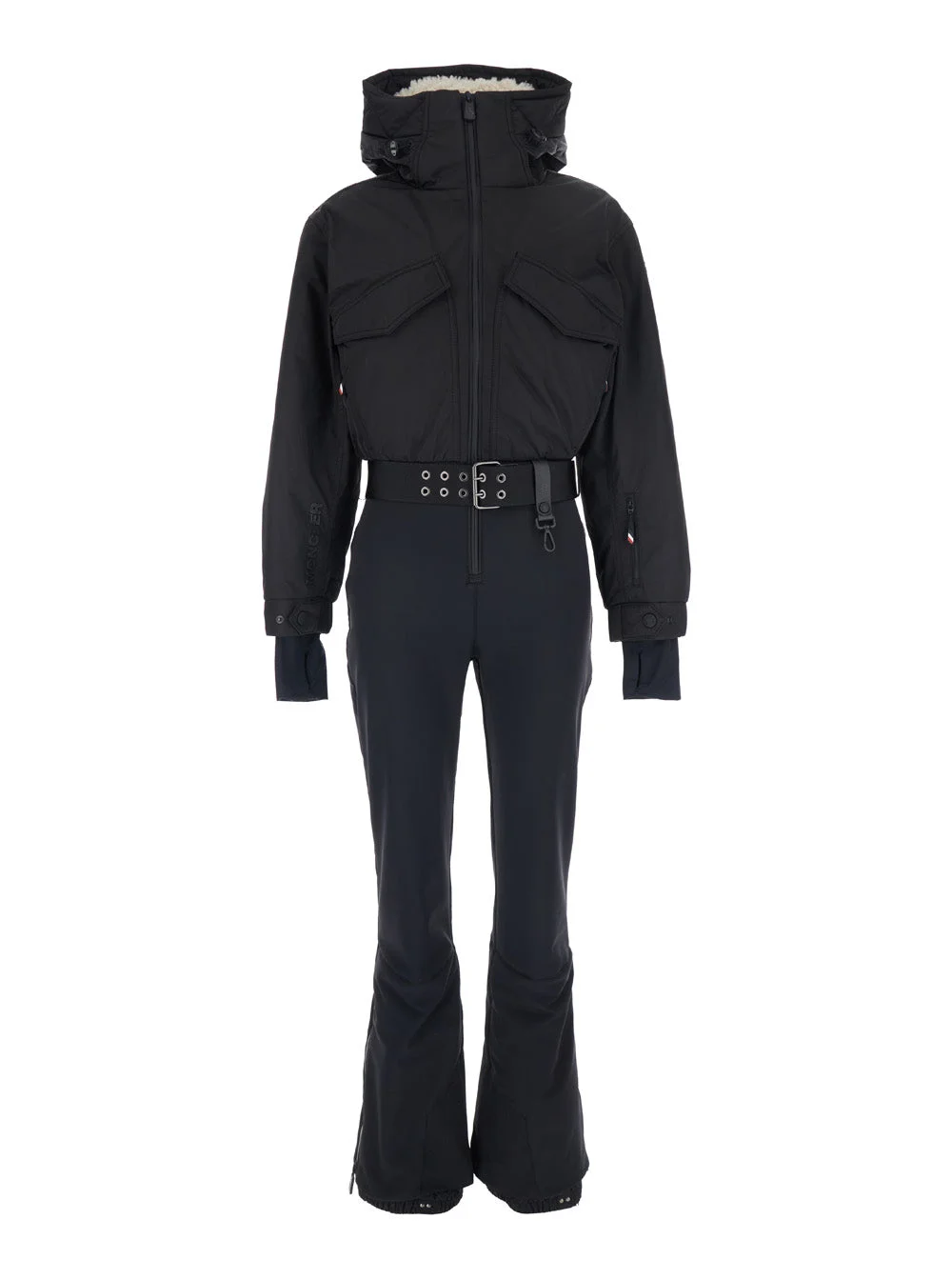 Moncler Grenoble Women Black Ski Suit With Adjustable Waist Belt And Logo Patch On The Sleeve In Tec