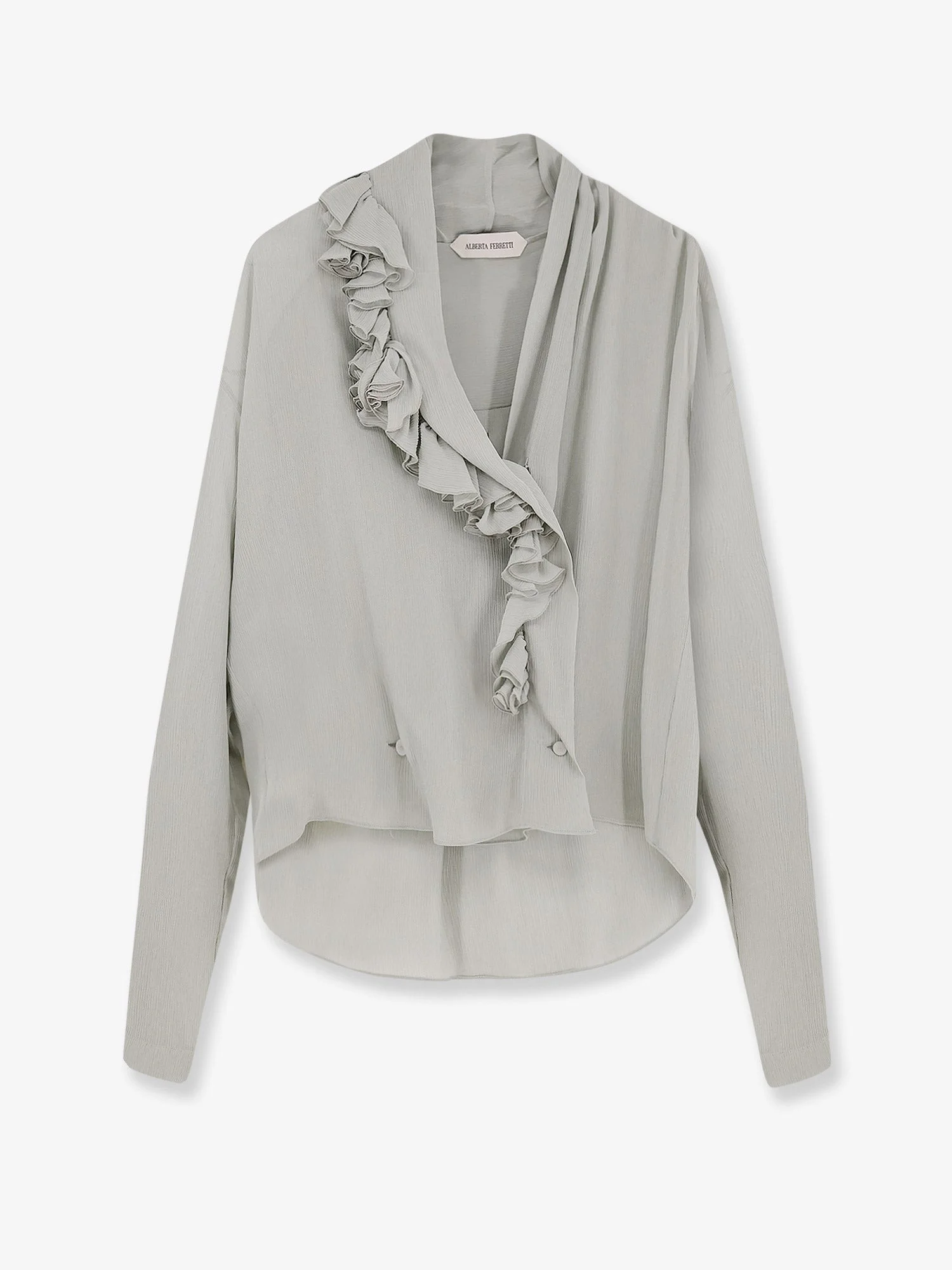 Brand: ALBERTA FERRETTI Product reference:252UA0213 Color reference:66170483 Color:Green Season:25A Gender:Woman Category 1:Abbigliamento Category 2:Shirts Made in:ITALIA Covered button closure Long sleeves V-neckline with ruffled detail Made in Italy 100% viscose SKU: 252UA021366170483 Size Type: IT SKU: 252UA02136170483 Our Products Are 100% Genuine. In All Cases We Stand By The Authenticity Of Every Product Sold On Our Site. All sales are final and we only accept returns for quality issue. Buyer is responsible for any import tax/duty if applicable.