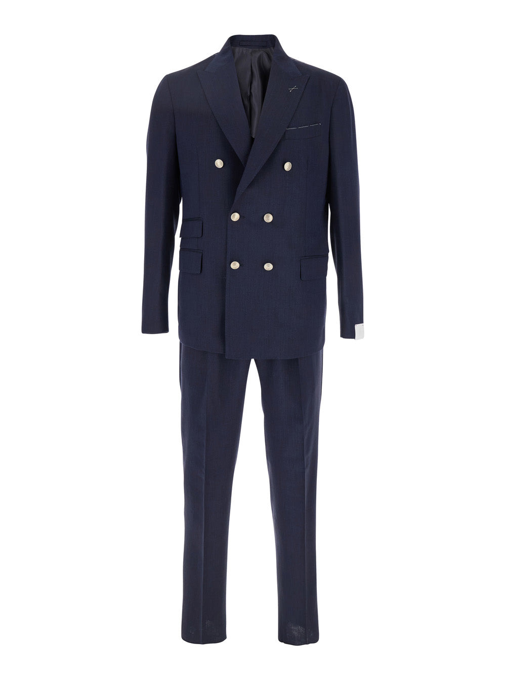 Eleventy Men Blue Double-Breasted Suit With Peak Revers And Jewel Buttons In Wool Stretch Man
