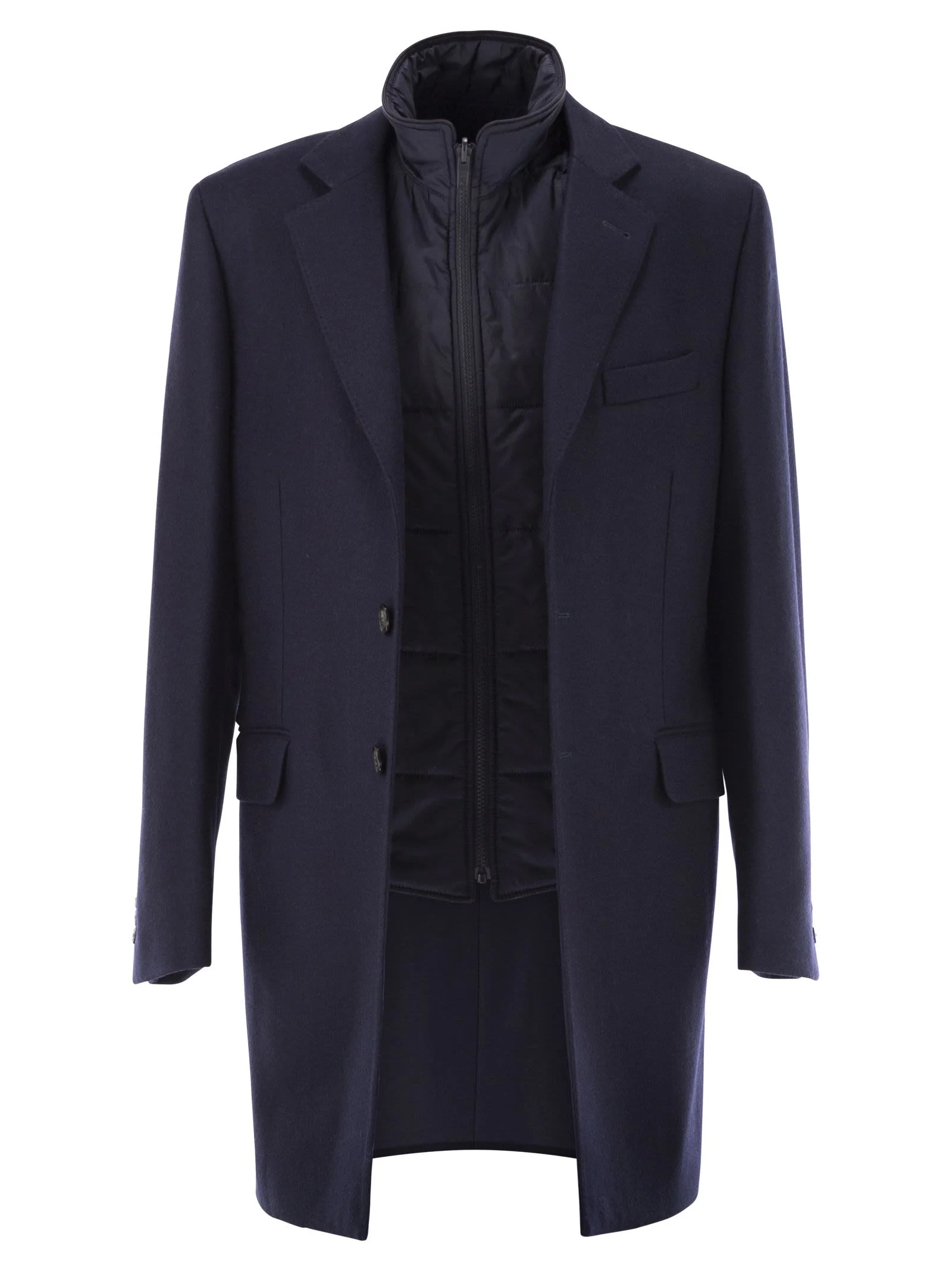 A meeting point between sartorial elegance and urban functionality, the iconic Double Coat redefines the canons of classic style by introducing the seasonless concept of 3-in-1 layering to the formal wardrobe. With three buttons, it is made of wool and cashmere blend cloth and features a pocket square, flap pockets and a back vent. The removable inner waistcoat, padded with ultra-light technical wadding, can also be worn separately. A double inner pocket completes the garment. - Removable inner waistcoat - Waistcoat zip fastening - Coat button fastening DESIGNER ID: NAM53511390GAHU802 90% Wool, 10% Cashmere Lining: 100% Viscose Gilet: 100% Polyamide Filling: 100% Polyester Size Type: INT SKU: NAM53511390GAHU802 Our Products Are 100% Genuine. In All Cases We Stand By The Authenticity Of Every Product Sold On Our Site. All sales are final and we only accept returns for quality issue. Buyer is responsible for any import tax/duty if applicable.