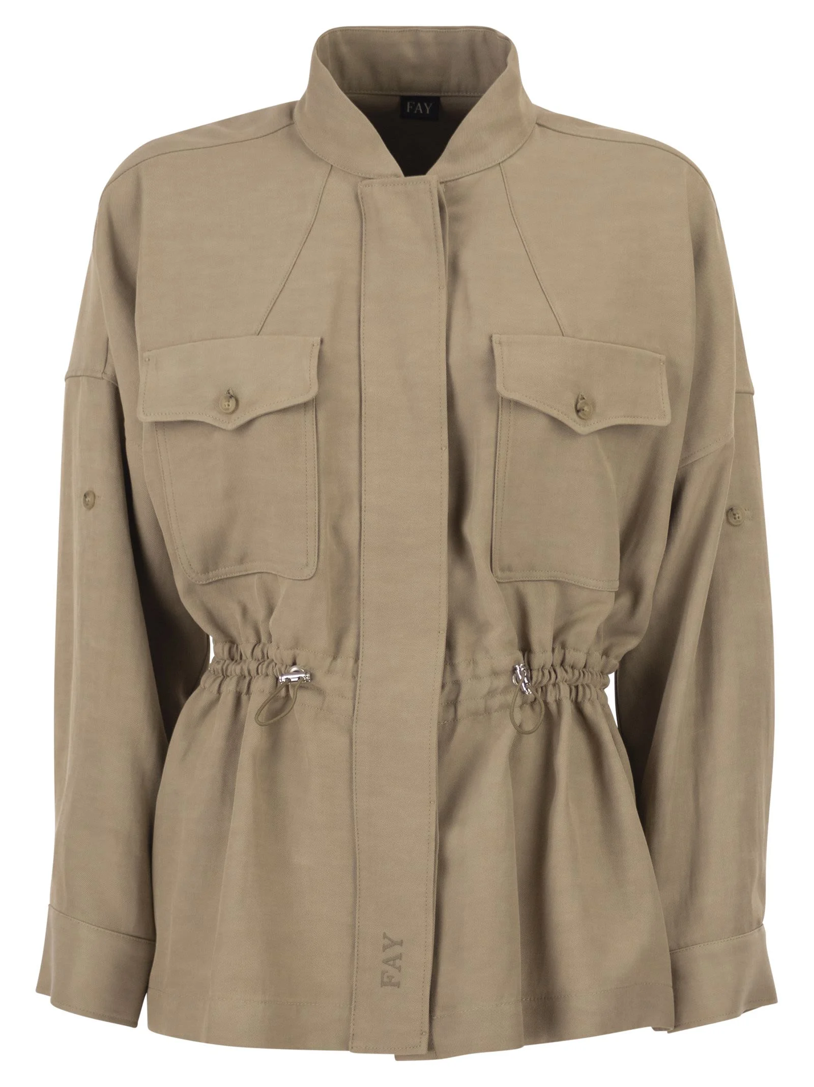 Overshirt in viscose and delave linen, with long sleeves that can be turned up, embellished with a band and button. Featuring upper flap pockets on the front, it has a drawstring at the waist to adjust the fit. The model is embellished with the Fay logo embroidered at the bottom. - Flap pockets - Covered button closure - Drawstring at the waist DESIGNER ID: NAW04525640ZDSC804 60% Viscose, 22% Lyocell, 18% Linen Size Type: INT SKU: NAW04525640ZDSC804 Our Products Are 100% Genuine. In All Cases We Stand By The Authenticity Of Every Product Sold On Our Site. All sales are final and we only accept returns for quality issue. Buyer is responsible for any import tax/duty if applicable.