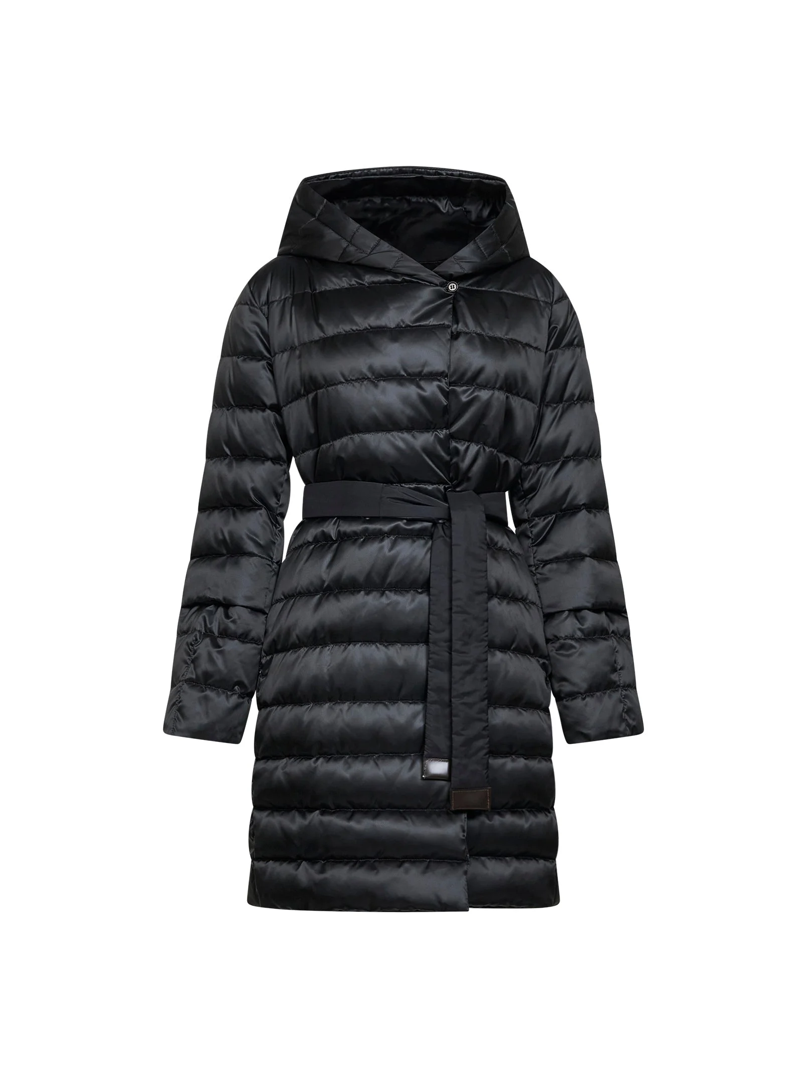 •Double-breasted one-button closure at collar •Hood •Sleeves can be worn long or three-quarter length •Matching adjustable and detachable belt at the waist with leather ends; adjustable and detachable slim tone-on-tone leather belt at the waist with metal buckle •Side in-seam pockets •Pure goose down filling •Reversible quilted iridescent water-repellent satin design with smooth taffeta inner side with iridescent water-repellent satin trims •Midi length •Black color •57% Polyamide, 43% Polyester •Made in Romania SKU: 2529496055600novef003 Our Products Are 100% Genuine. In All Cases We Stand By The Authenticity Of Every Product Sold On Our Site. All sales are final and we only accept returns for quality issue. Buyer is responsible for any import tax/duty if applicable.