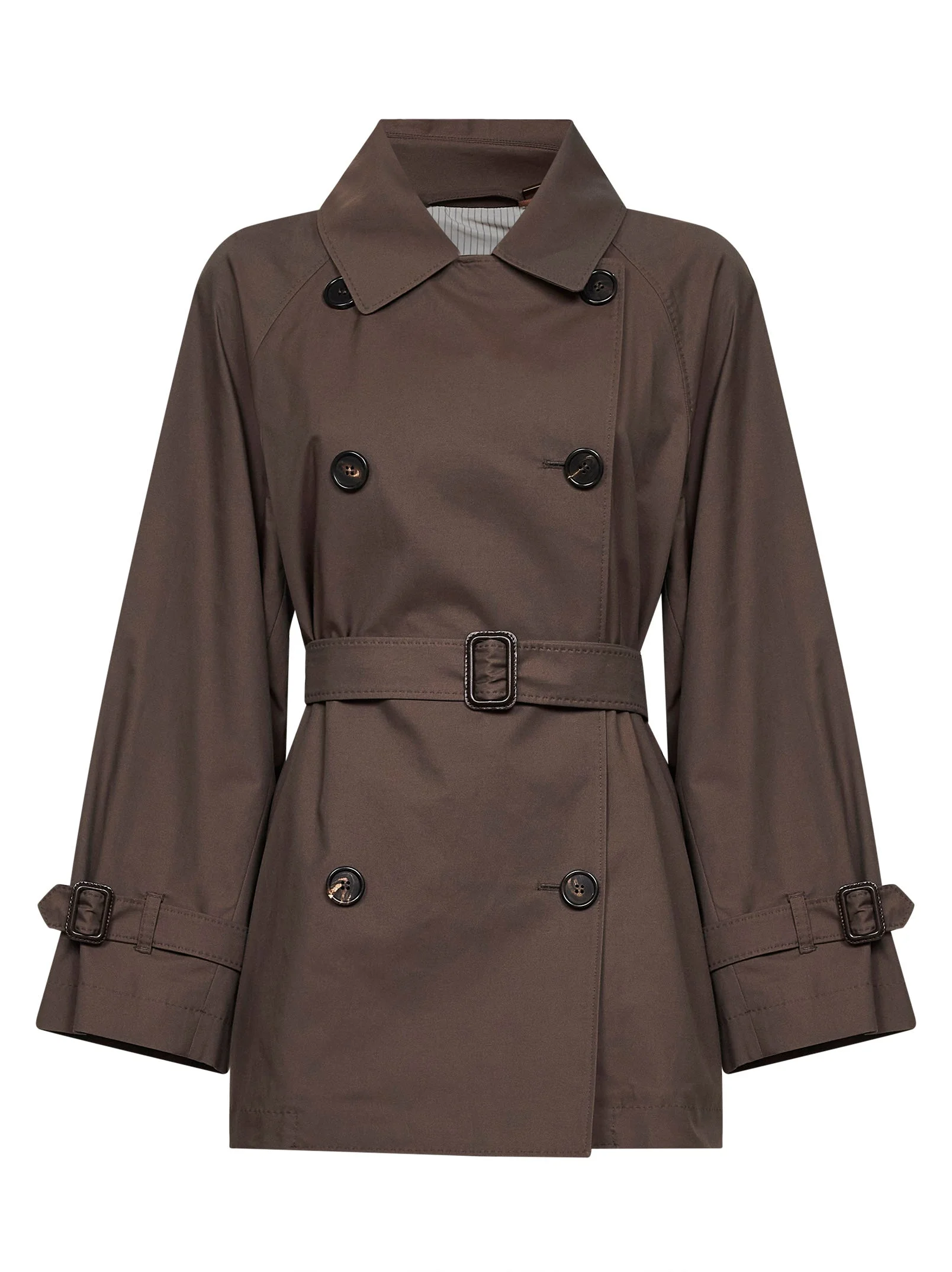 •Double-breasted eight-button placket •Shirt collar •Long raglan sleeves, adjustable belted cuffs with leather buckle •Matching adjustable and detachable belt at the waist with embossed logo at back and leather buckle •Double-welt side pockets •Buttoned rain cape at back •Central slit at back •Horn buttons •Half-lined in taffeta with jacquard logo tape •Water-repellent cotton-blend twill design; main fabric contains at least 50% cotton fibre grown in accordance with organic farming principles •Straight fit •Chocolate color •69% Cotton, 31% Polyester •Made in Romania SKU: 2619021114600mtccalle022 Our Products Are 100% Genuine. In All Cases We Stand By The Authenticity Of Every Product Sold On Our Site. All sales are final and we only accept returns for quality issue. Buyer is responsible for any import tax/duty if applicable.