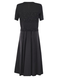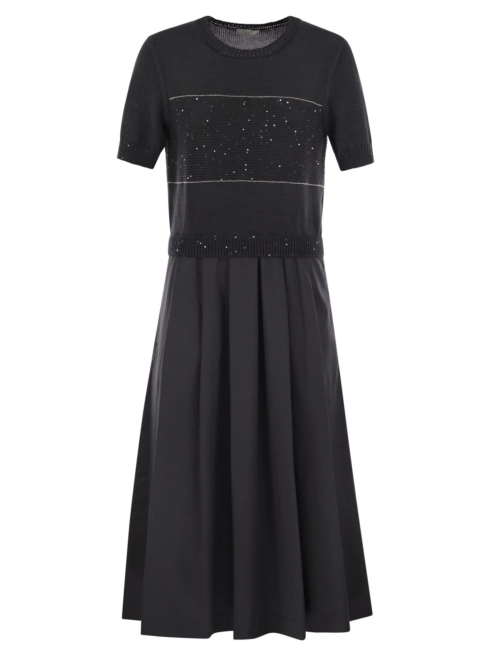 This dual-material midi dress combines the elegance of pure cotton cord with the glamour of micro sequins. The bodice, crafted with linx stitching and sequins on a smooth base, is embellished with a Punto Luce stripe that adds a bright and original touch. The round neckline and short sleeves make the design classic and versatile, while the flowing fabric skirt completes the silhouette with a touch of softness. The midi length and regular fit make this dress perfect for a sophisticated and refined look. - Dress with cotton yarn bodice and sequins - Linx stitching with sequins on a smooth base - Round neckline - Short sleeves - Maxi sequin stripe motif - Pleated skirt in contrasting fabric - Zip on the side - Regular fit DESIGNER ID: S82123F05E9110 E61 Yarn: 99% Cotton, 1% Polyester Fabric: 97% Cotton, 3% Elastane Size Type: IT SKU: S82123F05E9110E61 Our Products Are 100% Genuine. In All Cases We Stand By The Authenticity Of Every Product Sold On Our Site. All sales are final and we only accept returns for quality issue. Buyer is responsible for any import tax/duty if applicable.