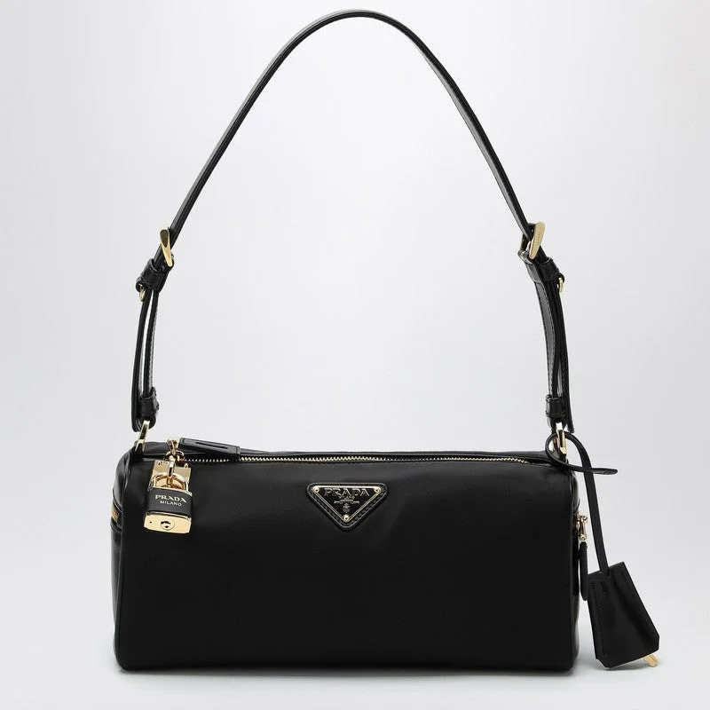 Black Re-Nylon medium shoulder bag from Prada featuring leather details, a top handle, a detachable key ring, side zipped pockets, an enamelled metal triangle logo on the front, a zip fastening, a branded padlock, a branded Re-Nylon interior, an internal zipped pocket and gold-tone metal hardware. Width 27 cm x Height 12 cm x Depth 10,5 cm Handle drop: 16 cm Size Type: INT Material: Leather SKU: 1BC233ODO2C8Q/QPRADAF0002100 Our Products Are 100% Genuine. In All Cases We Stand By The Authenticity Of Every Product Sold On Our Site. All sales are final and we only accept returns for quality issue. Buyer is responsible for any import tax/duty if applicable.