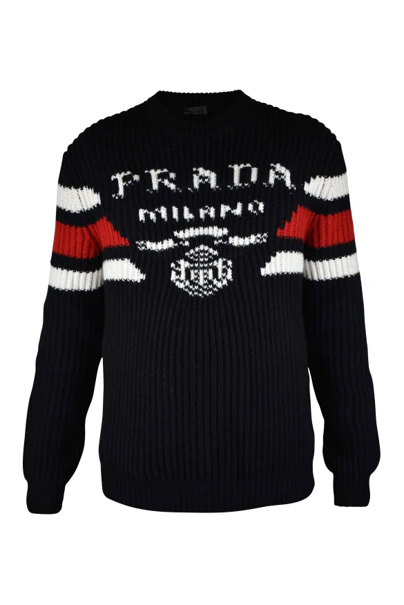 Prada Black cashmere sweater. Horizontal red and white logo on chest. Crew neck. Ribbed edges. Long sleeves. 100% cashmere. Size Type: INT SKU: UMB33910O9F0002 Our Products Are 100% Genuine. In All Cases We Stand By The Authenticity Of Every Product Sold On Our Site. All sales are final and we only accept returns for quality issue. Buyer is responsible for any import tax/duty if applicable.
