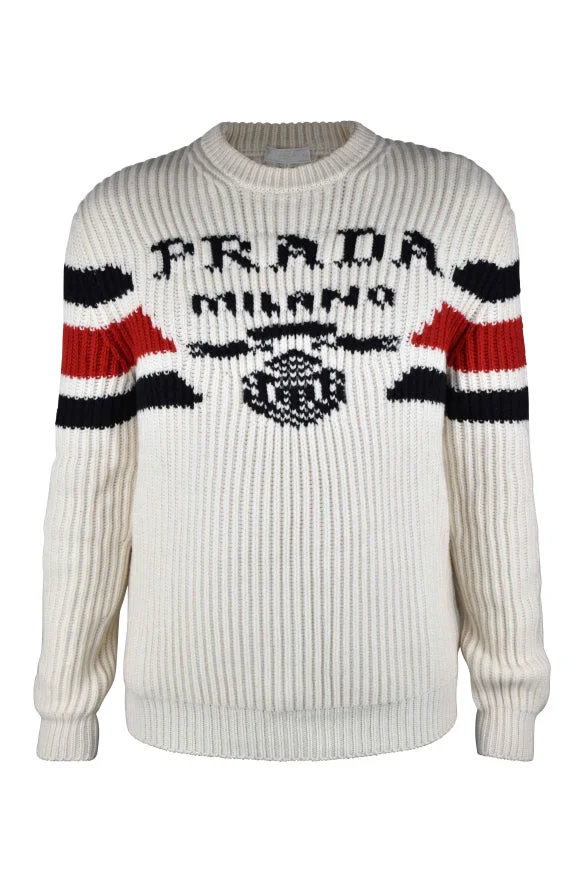 Sweater Prada in white cashmere. Horizontal red and black logo on chest. Crew neck. Ribbed edges. Long sleeves. 100% cashmere. Size Type: INT SKU: UMB33910O9F0009 Our Products Are 100% Genuine. In All Cases We Stand By The Authenticity Of Every Product Sold On Our Site. All sales are final and we only accept returns for quality issue. Buyer is responsible for any import tax/duty if applicable.