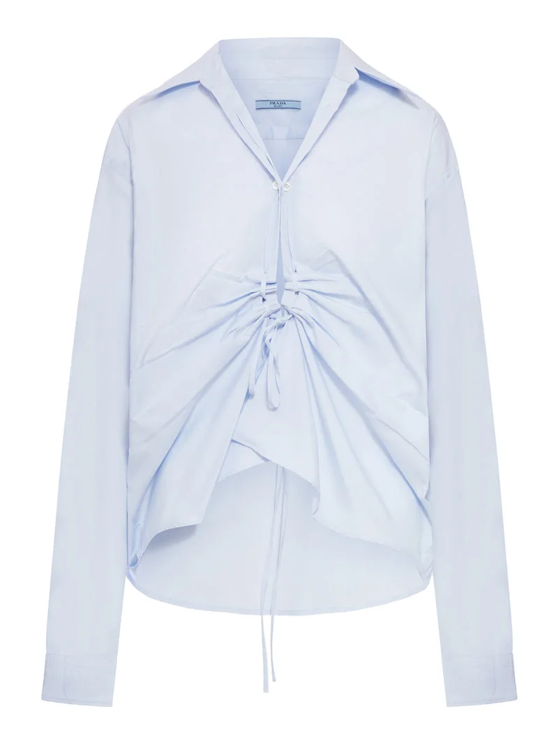 - Shirt collar - Front lace-up closure - Long sleeves - Woven triangle logo - Shapeable detail on the collar and hem - 100% cotton - Regular fit Made in Italy Composition: Cotton 100% cotton Color code: F0M10 ASTRO Size Type: IT SKU: P481ISOOO1650 Our Products Are 100% Genuine. In All Cases We Stand By The Authenticity Of Every Product Sold On Our Site. All sales are final and we only accept returns for quality issue. Buyer is responsible for any import tax/duty if applicable.