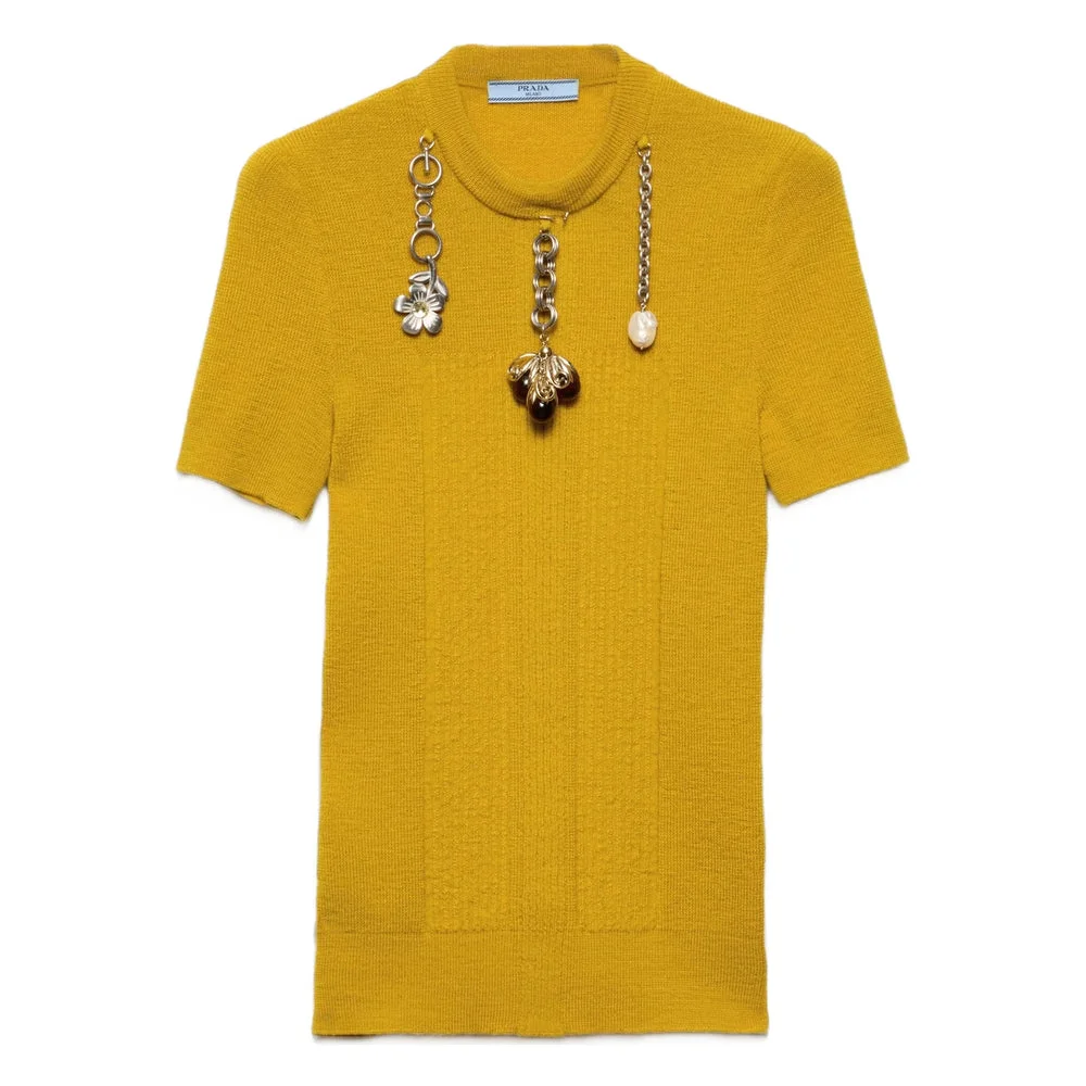 yellow ribbed knit short sleeves crew neck charm embellishment MADE IN:ItalyMATERIAL:Fabric: 100.0%COLOR:YELLOW SKU: P24V2LSOOO17ZEF0037 Our Products Are 100% Genuine. In All Cases We Stand By The Authenticity Of Every Product Sold On Our Site. All sales are final and we only accept returns for quality issue. Buyer is responsible for any import tax/duty if applicable.