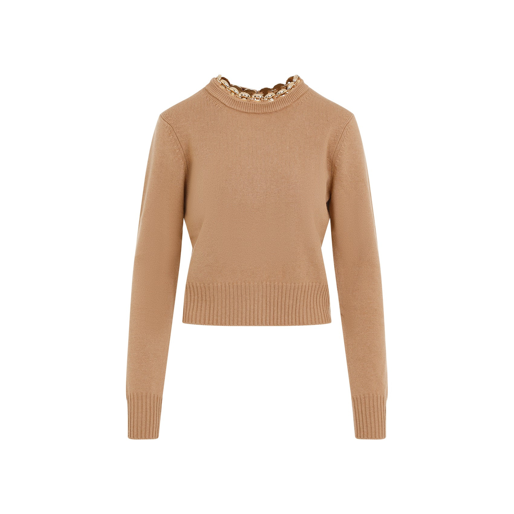 Rabanne Camel Brown Merino Wool Pullover. Crafted in merino wool and cashmere blend. Round neck, gold-tone metallic chain detail on the collar, back buttoned fastening, long sleeves, ribbed cuffs and hem. Wool | 70%MERINO WOOL 30%CASHMERE Size Type: INT SKU: 24AMPU294ML0239Nude&Neutrals Our Products Are 100% Genuine. In All Cases We Stand By The Authenticity Of Every Product Sold On Our Site. All sales are final and we only accept returns for quality issue. Buyer is responsible for any import tax/duty if applicable.