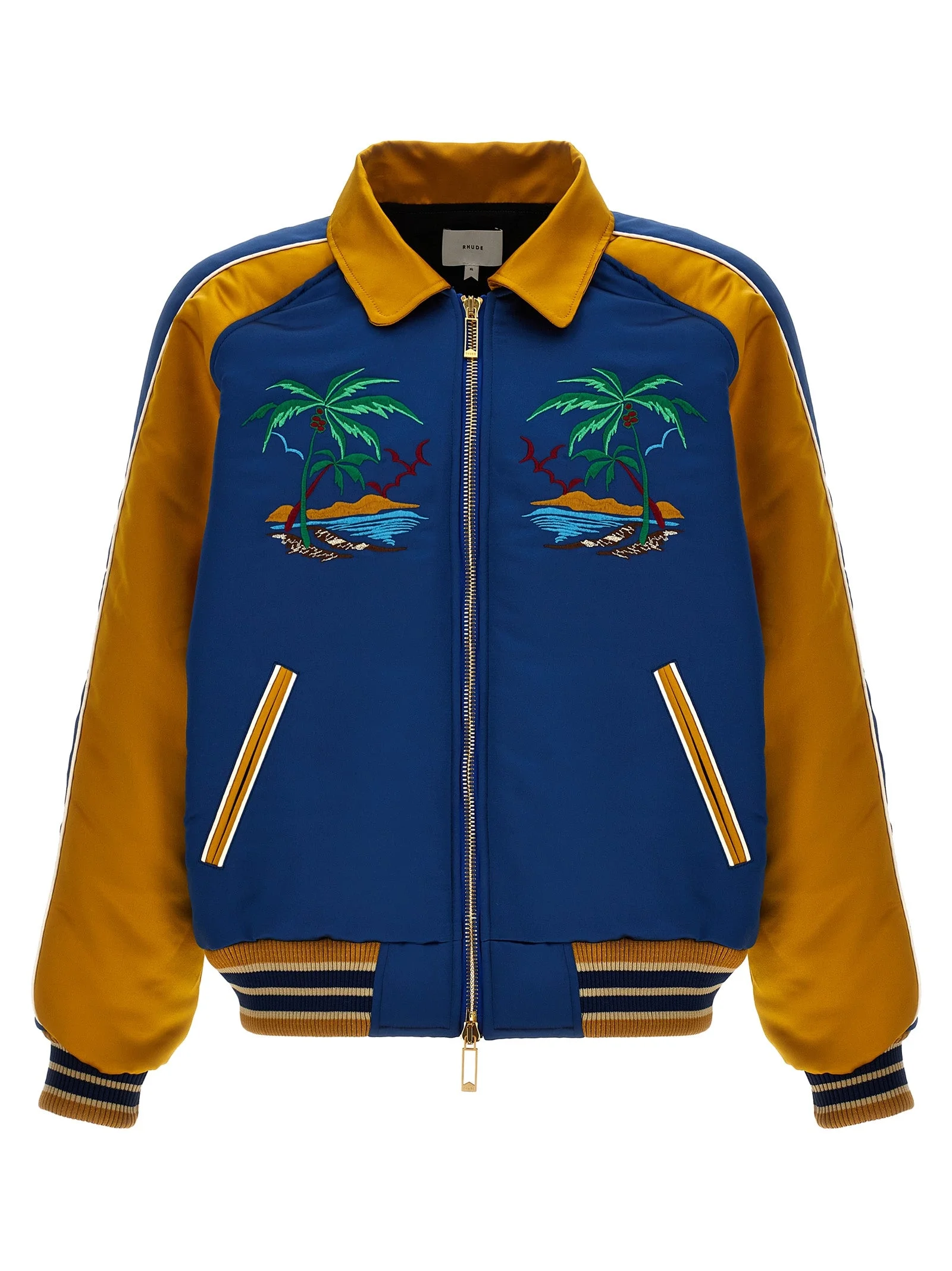 'Palm Eagles Souvenir' satin bomber jacket with all-over embroidery, zip closure, pockets, long sleeves with knitted cuffs. True to size fit 100% polyester SKU: RHPS24JA076131332133 Our Products Are 100% Genuine. In All Cases We Stand By The Authenticity Of Every Product Sold On Our Site. All sales are final and we only accept returns for quality issue. Buyer is responsible for any import tax/duty if applicable.