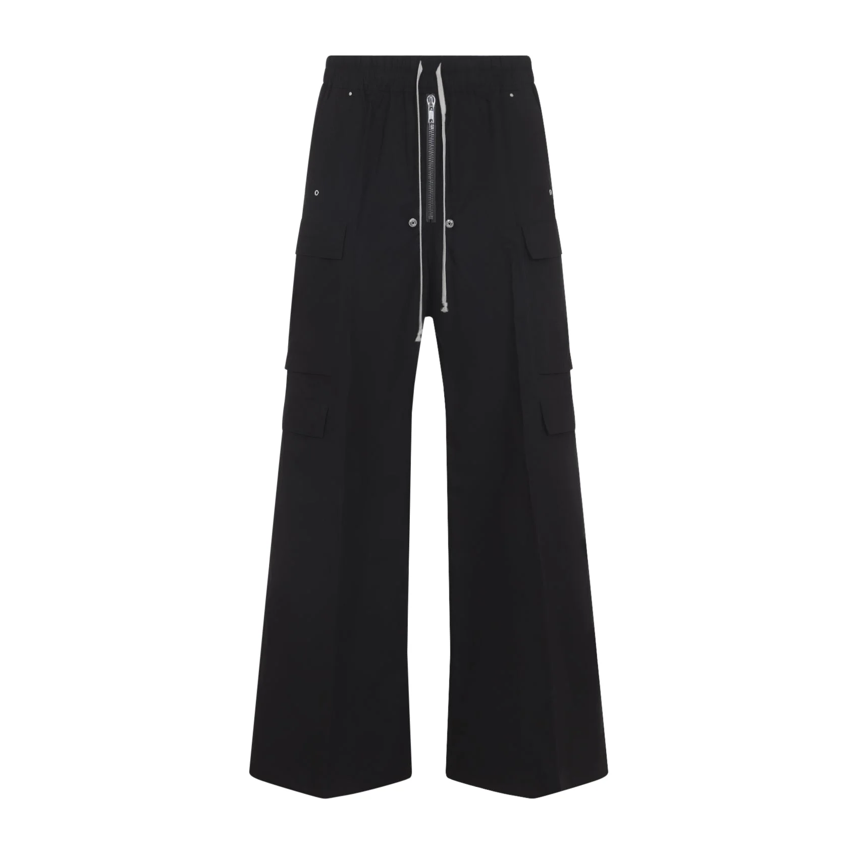 Rick Owens Cargo Belas Black Cotton Pants. Flared pants crafted from black cotton, featuring an elastic waistband with the iconic drawstring, a front zip fastening, silver-toned metal eyelets detailing, slant pockets, two side cargo pockets, two welt pockets on the back, a wide leg, and a floor length. Cotton | 100%COTTON Size Type: IT SKU: RU01F2339PBlack Our Products Are 100% Genuine. In All Cases We Stand By The Authenticity Of Every Product Sold On Our Site. All sales are final and we only accept returns for quality issue. Buyer is responsible for any import tax/duty if applicable.