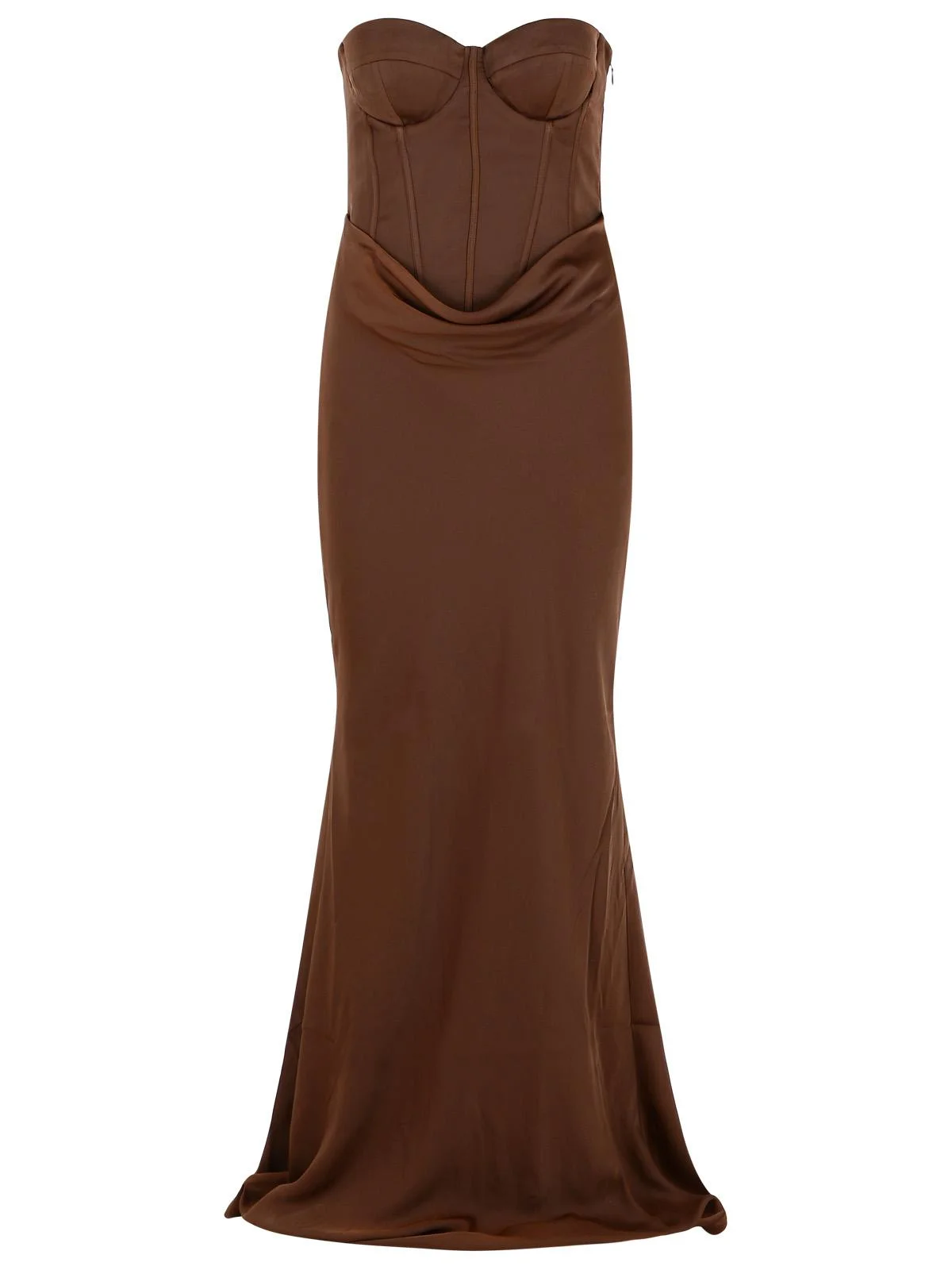 Rotate Long Dress With Corset In Brown Polyester Satin Women