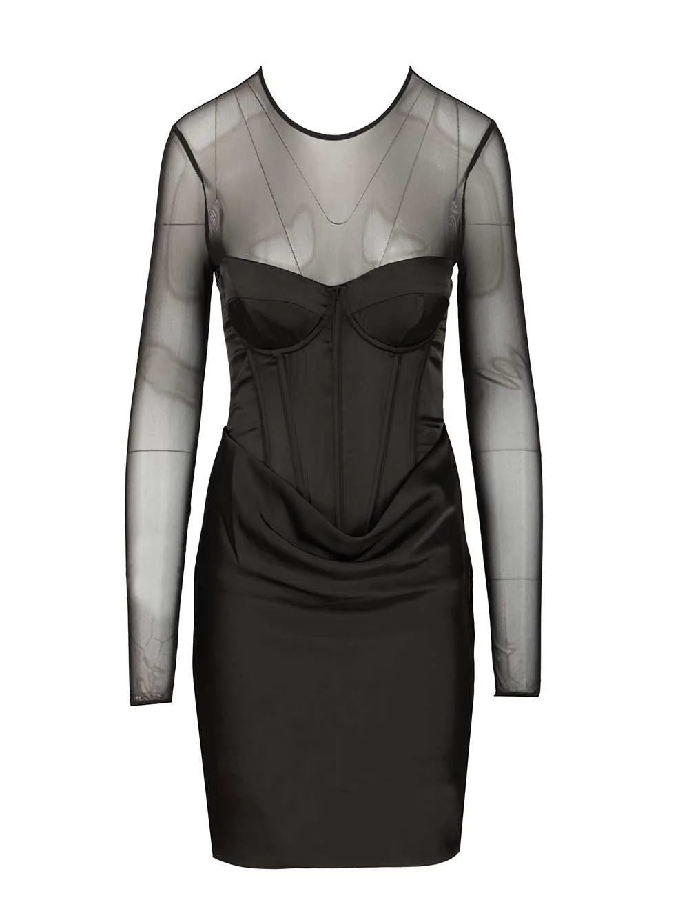 Satin corset mini dress by Rotate, featuring a long-sleeved sheer mesh top worn over a corset bodysuit with exposed seams and a bustier construction, a draped satin skirt at the front, and a zip and button fastening at the back. 60% POLYESTER (RECYCLED) 40% POLYESTER Made in: CN SKU: 115252100100 Our Products Are 100% Genuine. In All Cases We Stand By The Authenticity Of Every Product Sold On Our Site. All sales are final and we only accept returns for quality issue. Buyer is responsible for any import tax/duty if applicable.