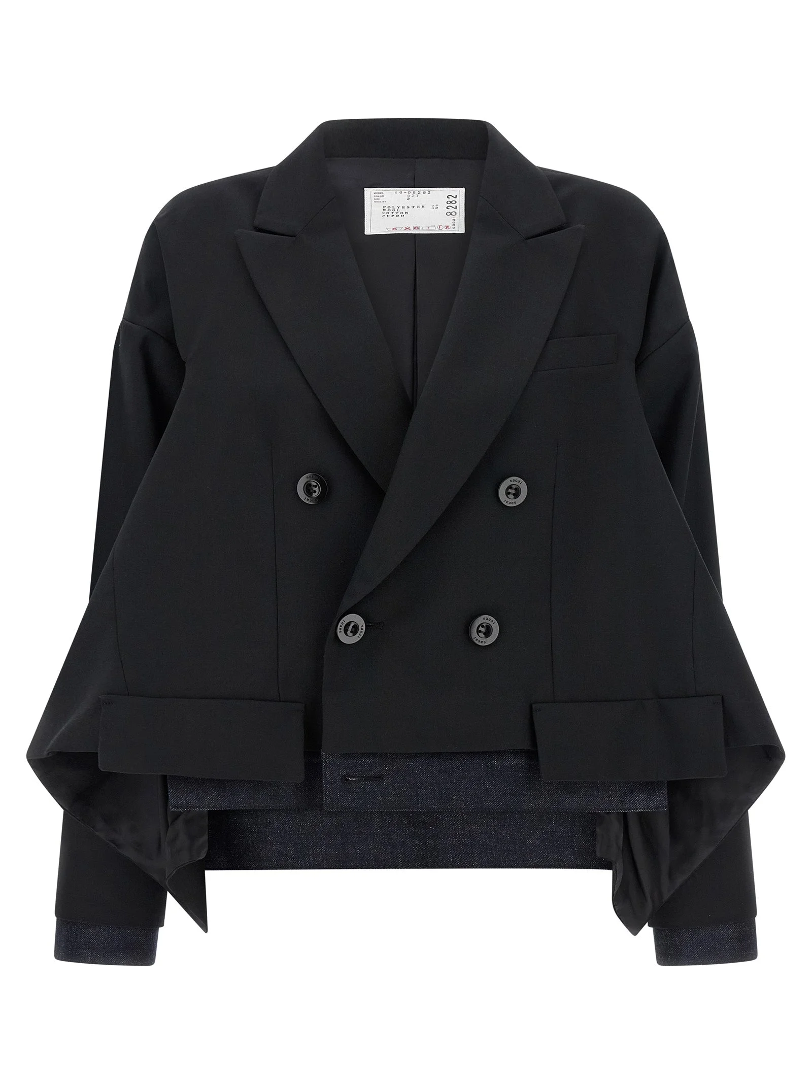 Blazer in wool blend with cotton denim inserts, lining, double-breasted crop style with front button closure, peak lapels, pocket, long puff sleeves with dropped shoulders and double layer cuffs, asymmetrical hem. true to size fit 70% polyester, 30% wool SKU: 2608282027 Our Products Are 100% Genuine. In All Cases We Stand By The Authenticity Of Every Product Sold On Our Site. All sales are final and we only accept returns for quality issue. Buyer is responsible for any import tax/duty if applicable.