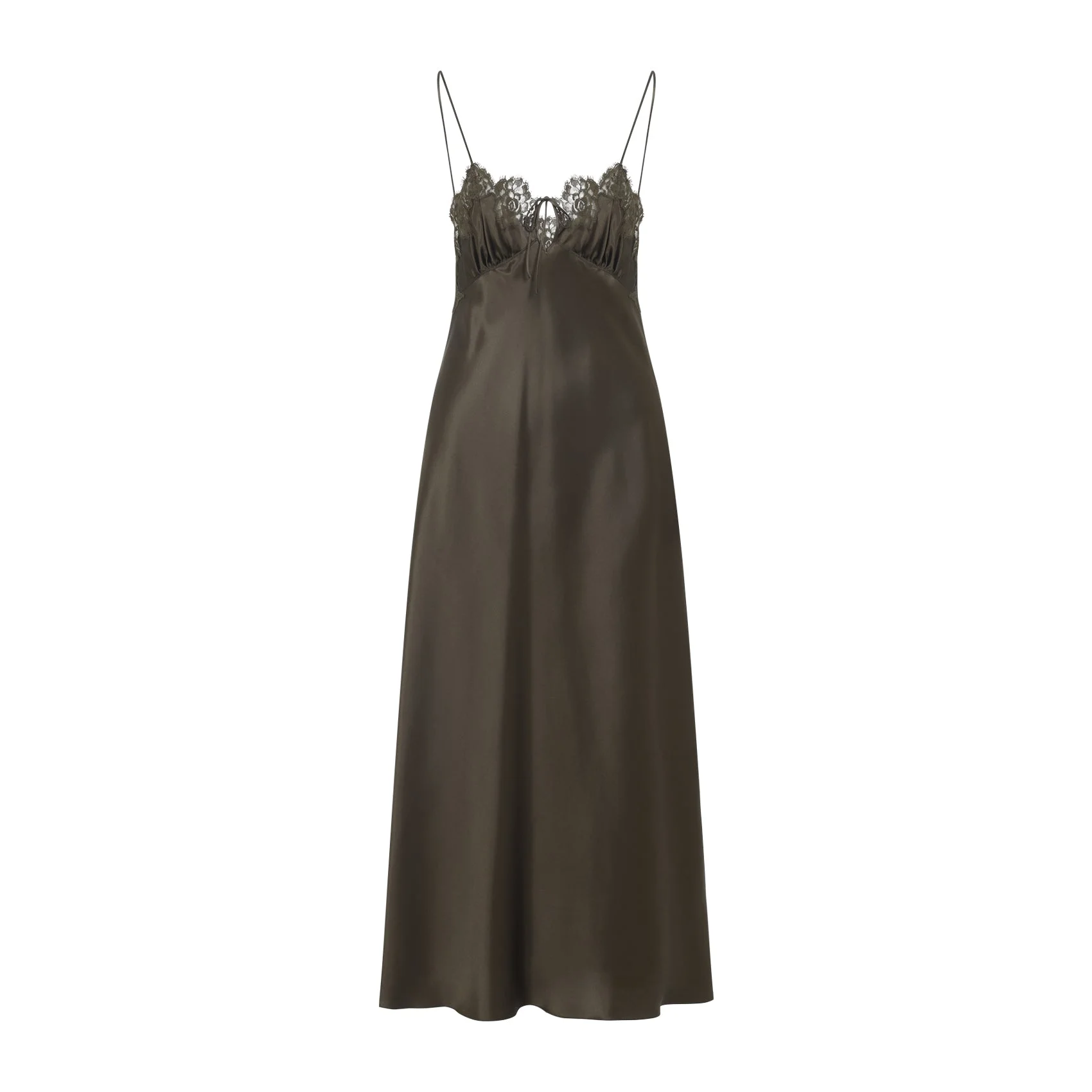 Saint Laurent Kaki Green Silk Dress. Pure kaki green silk dress. Thin shoulder straps, front keyhole detail, front tonal strap, lace details on the neck and on the back, sleeveless, feet-length, flared skirt, straight hem. Silk | 100%SILK Size Type: FR SKU: 839551Y7G27Green Our Products Are 100% Genuine. In All Cases We Stand By The Authenticity Of Every Product Sold On Our Site. All sales are final and we only accept returns for quality issue. Buyer is responsible for any import tax/duty if applicable.